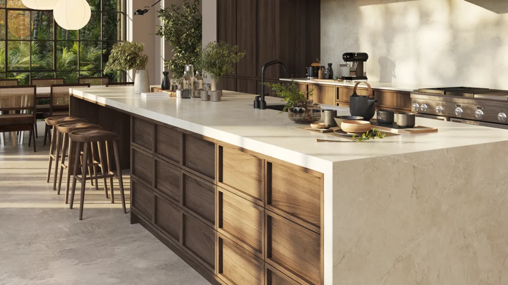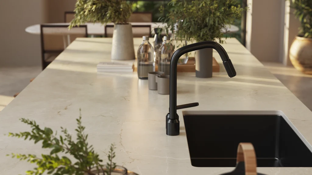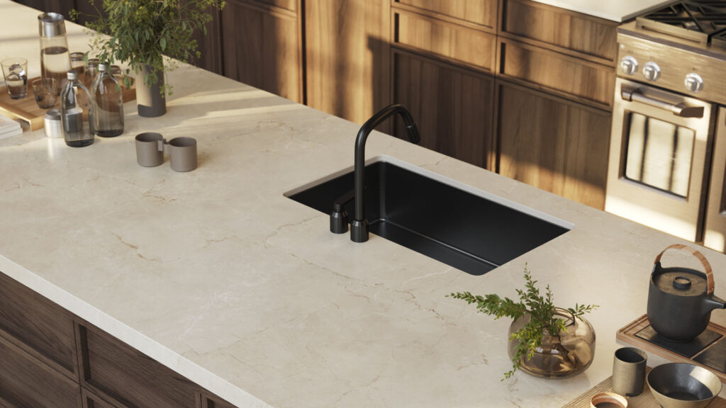 De Caesarstone 915 Almond Stone straalt een zachte, natuurlijke warmte uit dankzij zijn rustige beige oppervlak met een fijne, aangename textuur. Over deze serene basis ontvouwt zich een subtiel samenspel van fijne aders, die in lagen diepte en charme toevoegen zonder te overheersen. Het blad voelt elegant en ingetogen aan, met een harmonieuze balans tussen zachte kleur en delicate beweging. Almond Stone creëert een rustige, luxueuze sfeer die perfect past bij zowel minimalistische als warme, klassieke interieurs. Het resultaat is een tijdloos oppervlak dat comfort, verfijning en een natuurlijke uitstraling combineert in één prachtig design.