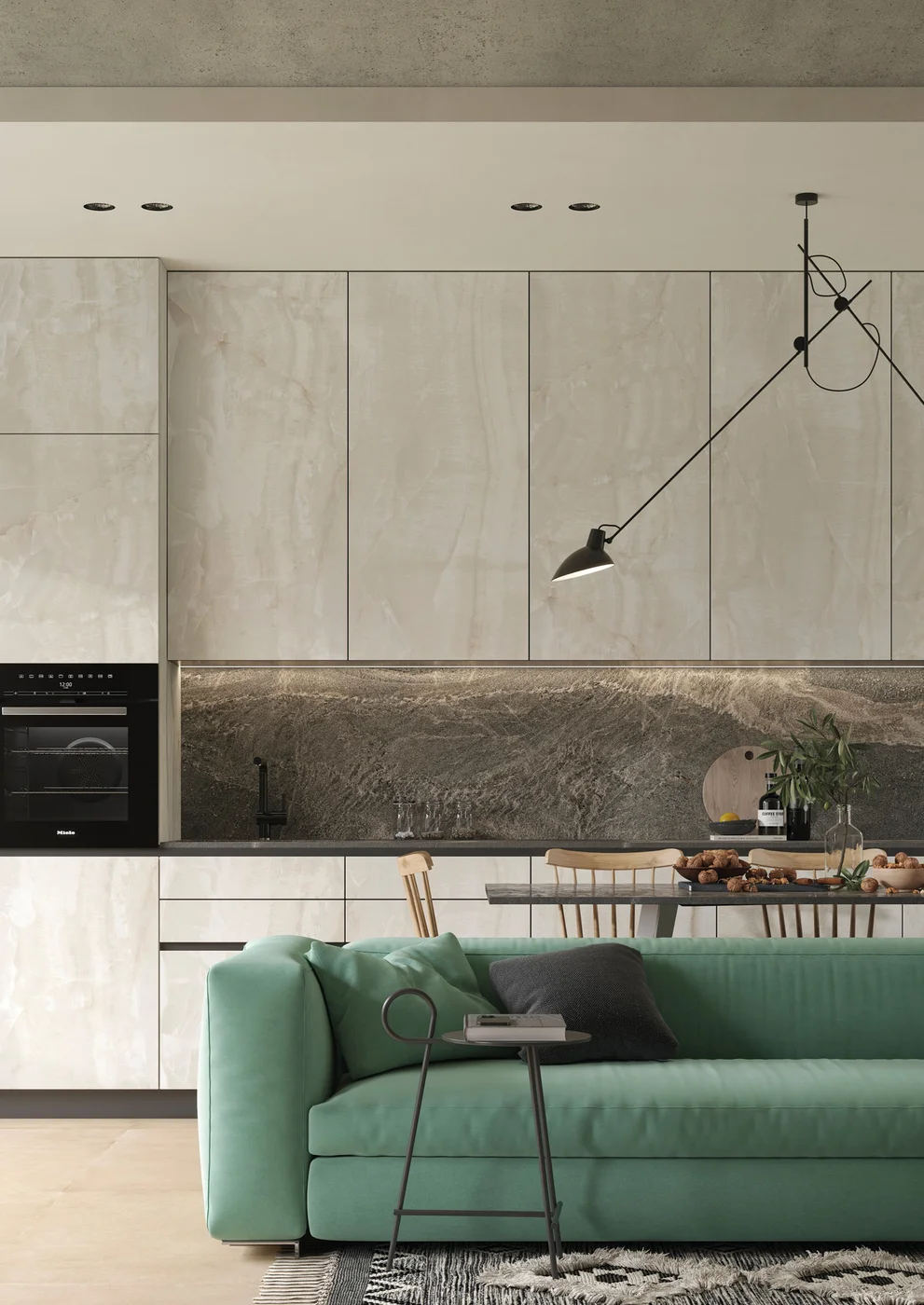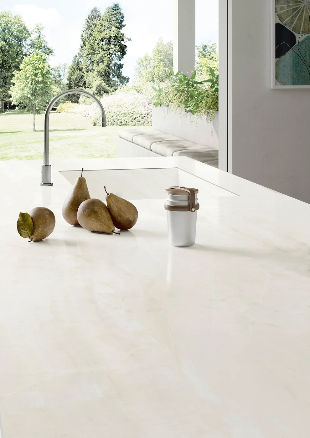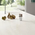 Sapienstone Bright Onyx is een elegante porseleinen grootformaat plaat met een ivoor-witte basis en subtiel vloeiende aders in beige, parelgrijs en lichte goudtinten, wat een zachte, bijna kristallijne uitstraling geeft die doet denken aan natuurlijk onyx. De organische adertekening lijkt diep door het materiaal heen te lopen, waardoor elke slab een unieke visuele dimensie krijgt. Het materiaal is verkrijgbaar in zowel polished als natural finish en combineert een verfijnde, lichte esthetiek met de technische voordelen van premium porselein — zoals duurzaamheid, onderhoudsgemak en weerstand tegen krassen, hitte en vlekken — ideaal voor werkbladen, vloeren, wanden en meubeltoepassingen in residentiële en commerciële projecten.