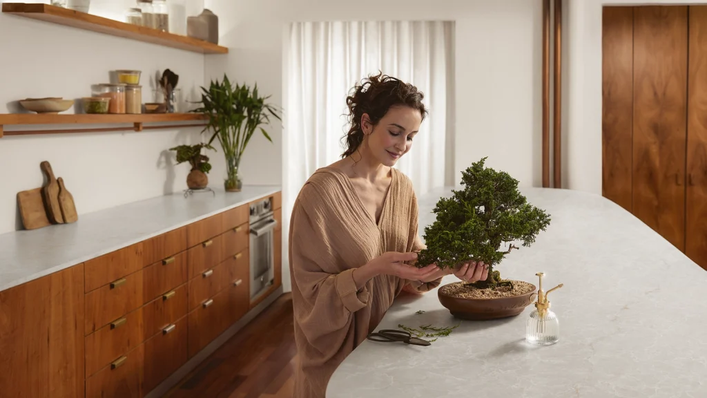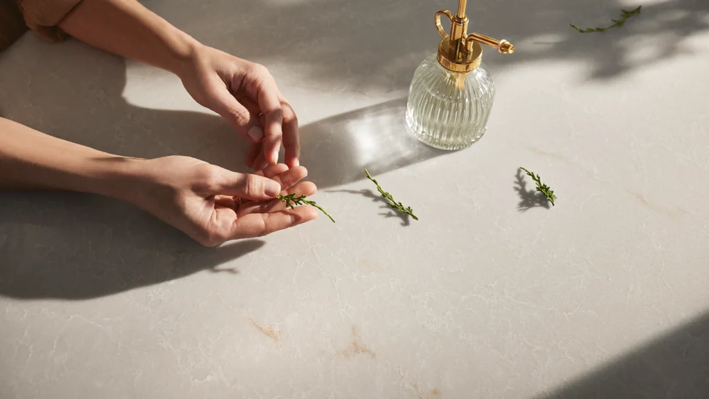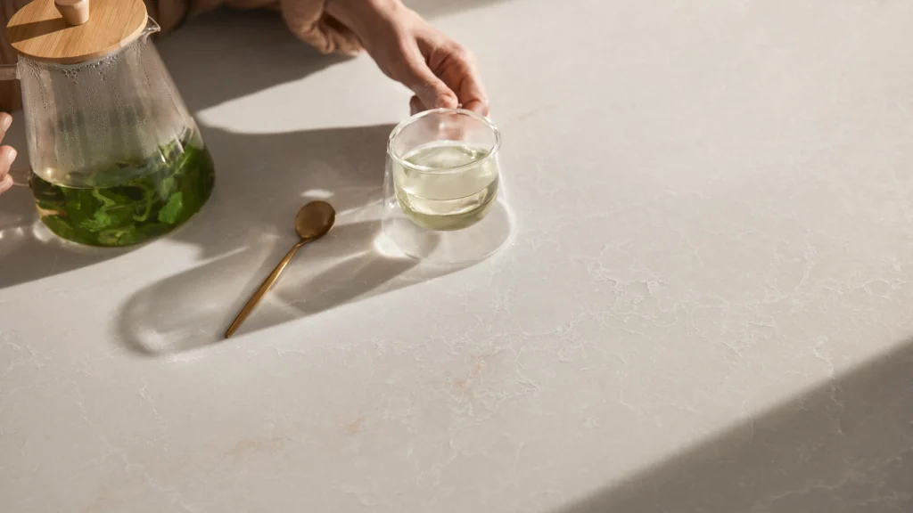 De Caesarstone 5310 Brillianza verenigt een mysterieus sprankje kristallijne doorschijnendheden met een koelgrijze basis waarin ijzig witte nerven elegant vervagen. Deze dynamische aderen creëren een subtiel spel van licht en schaduw, alsof het oppervlak licht vangt en reflecteert vanuit elke hoek. Minerale accenten in zachte, poederachtige perzikkleuren voegen een onverwachte warme hint toe, wat het geheel een verfijnde energie geeft zonder zijn serene uitstraling te verliezen. Brillianza voelt zowel koel als levendig, met een delicate balans tussen dynamiek en rust. Het resultaat is een elegant, visueel intrigerend oppervlak dat stijlvol en tijdloos oogt in elk interieur.