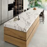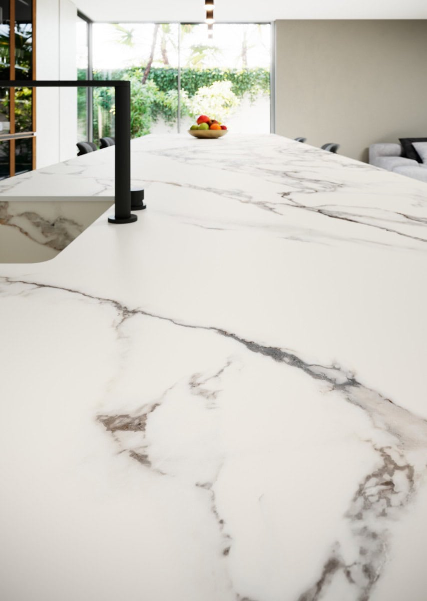 Calacata Vaglie, een verfijnde witte steen met karakteristieke ovale aders die variëren van koel blauwachtig tot warm roodbruin, is een uitgesproken luxe materiaal met een indrukwekkende esthetiek. De subtiele maar dynamische kleurschakeringen geven deze steen een unieke diepte en een verfijnd karakter dat onmiddellijk opvalt in elk interieur.