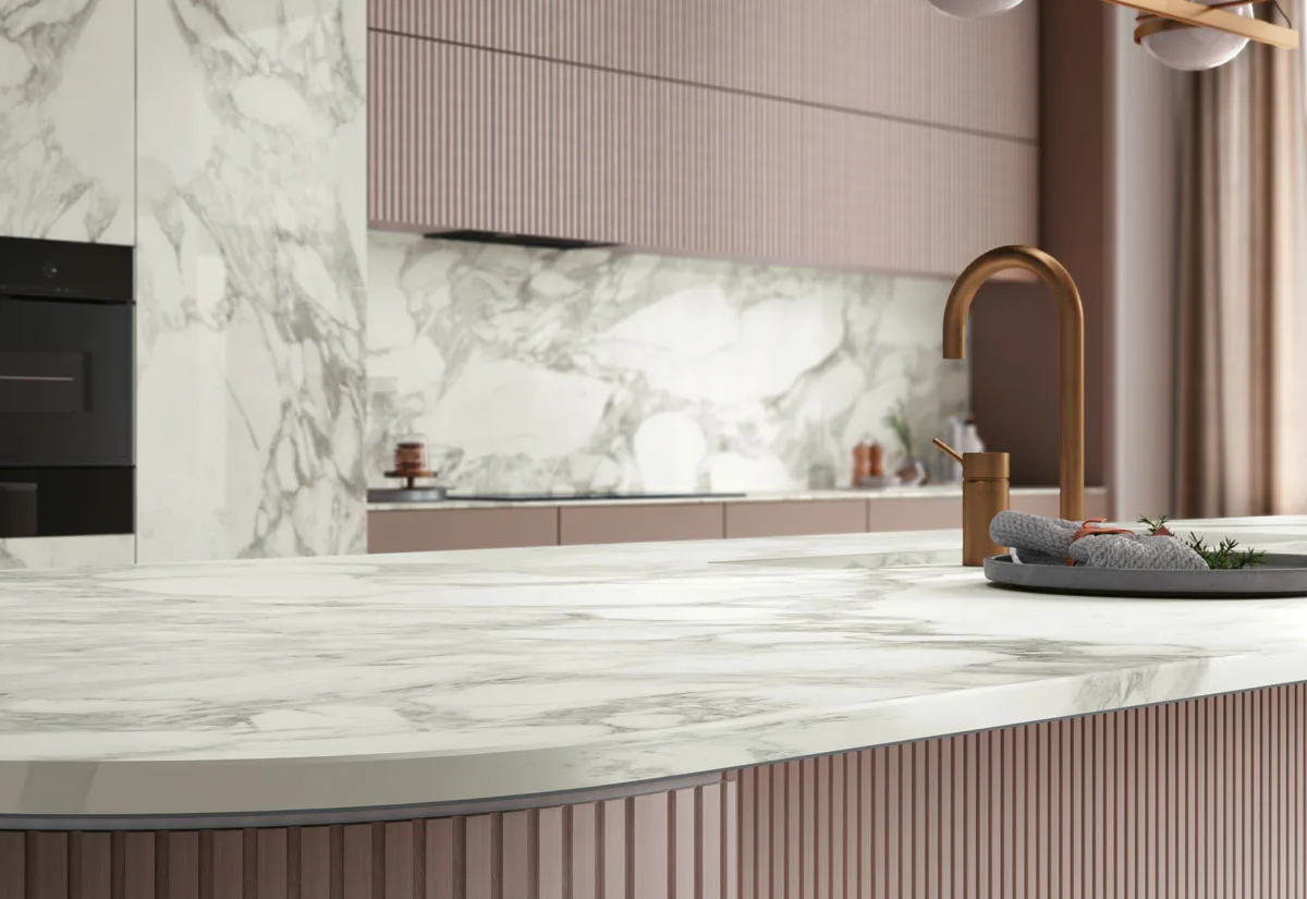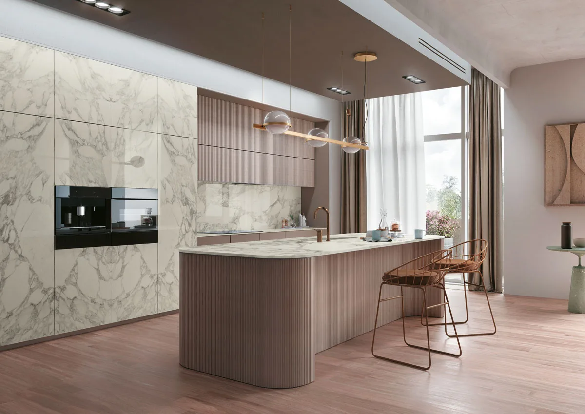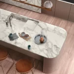 Calacatta Magnifico van Infinity Surfaces is een indrukwekkende porseleinen grootformaat plaat die de klassieke pracht van Calacatta-marmer naar voren brengt met een stralend witte achtergrond en krachtige grijze en gouden aders voor een monumentale, visuele impact. Dankzij de geavanceerde porseleinen technologie met continu doorlopende aders heeft dit materiaal een uitzonderlijk natuurlijke uitstraling en naadloze visuele continuïteit over het oppervlak. Calacatta Magnifico is ideaal voor werkbladen, vloeren, wanden en meubels in zowel residentiële als commerciële projecten waar luxe en karakter centraal staan. Bovendien biedt het de duurzaamheid, kras- en vlekbestendigheid en onderhoudsgemak die premium keramiek kenmerkt.