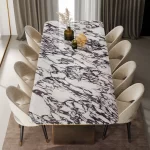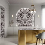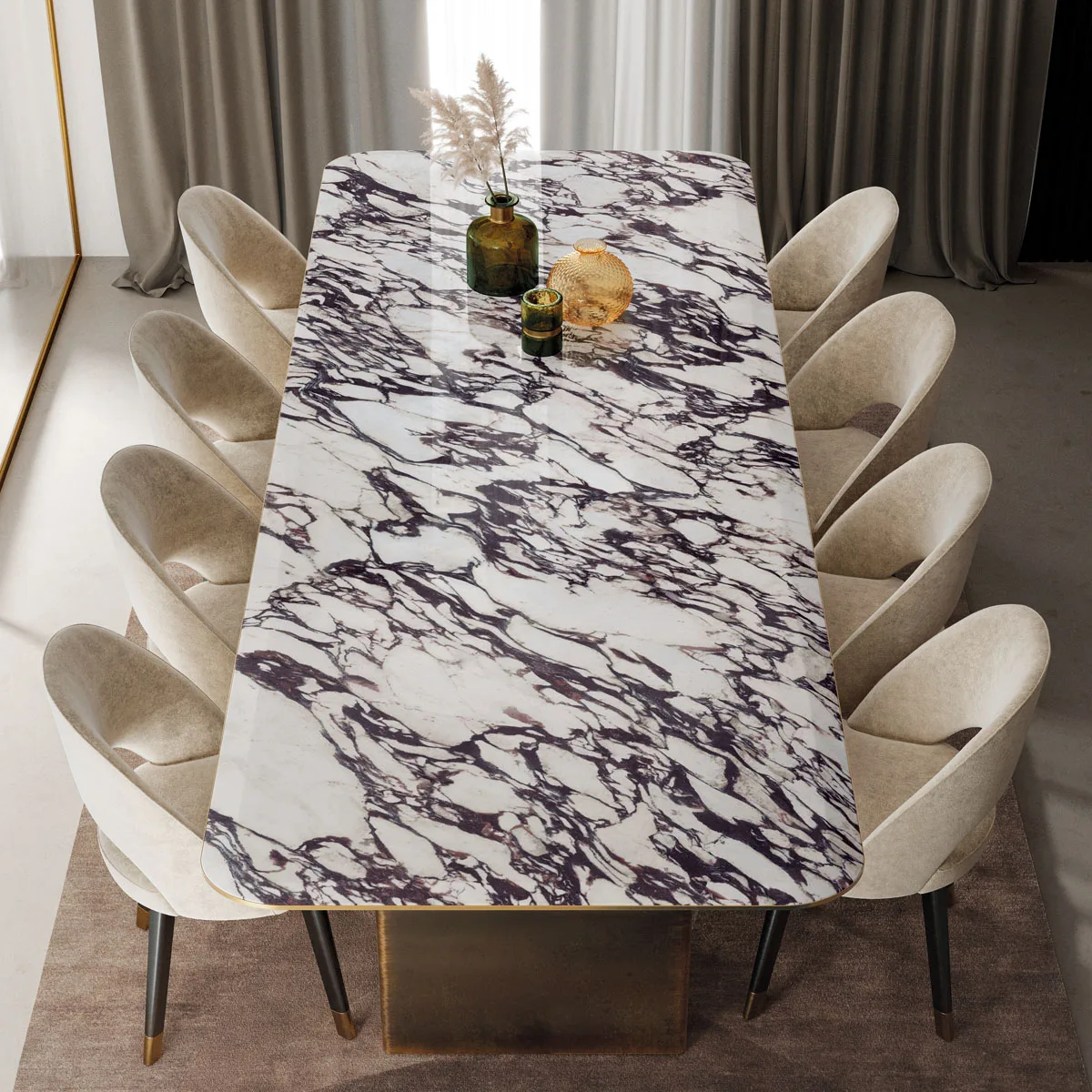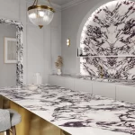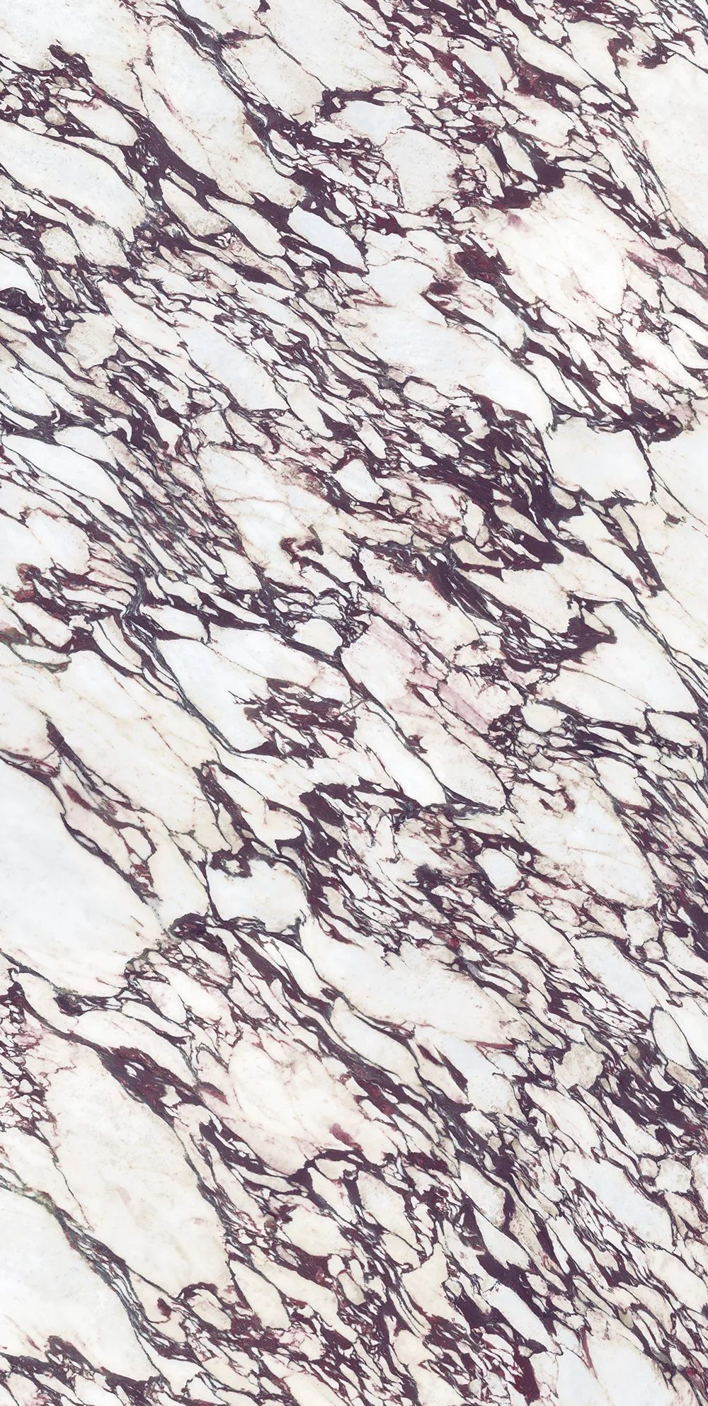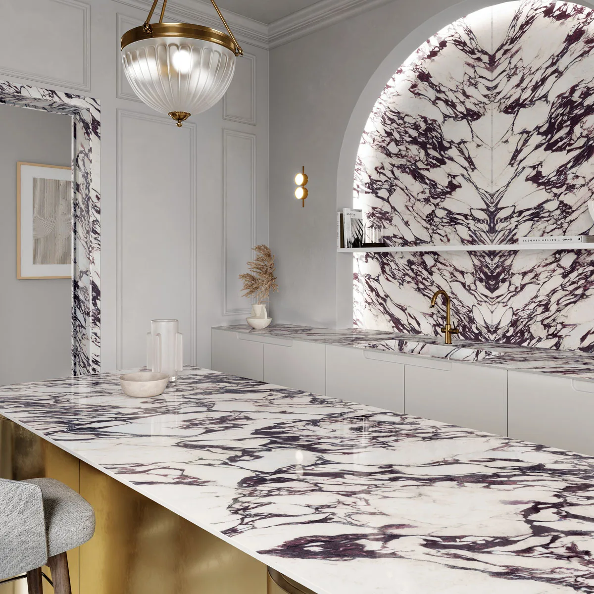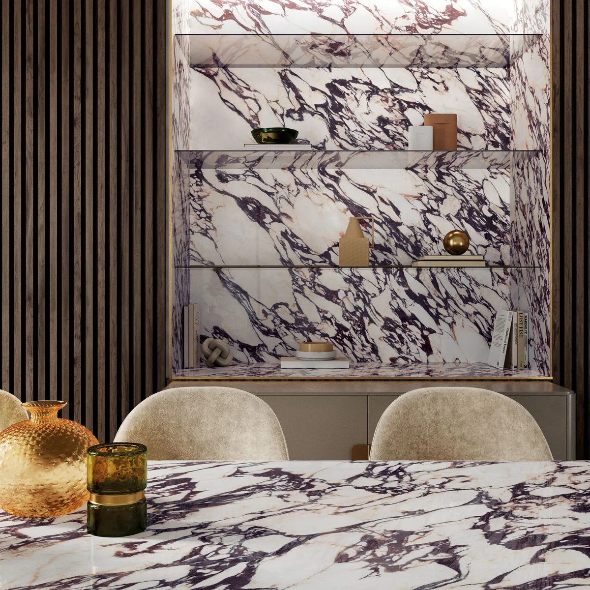 Calacatta Viola van Infinity Surfaces is een opvallende porseleinen grootformaat plaat met een warme, witte achtergrond die wordt gekruist door intense paarse aders en subtiele gouden nuances, wat zorgt voor een dramatische en luxueuze marmerlook. Dit materiaal biedt de rijke expressie van natuursteen, maar met de voordelen van keramiek: uitstekende duurzaamheid, onderhoudsgemak en hoge resistentie tegen krassen, vlekken en hitte. Door het grote formaat en de verfijnde tekening is Calacatta Viola perfect voor werkbladen, vloeren, wanden en meubeltoepassingen in zowel residentiële als commerciële projecten waar een opvallend en elegant statement gewenst is.