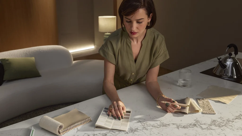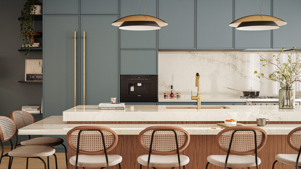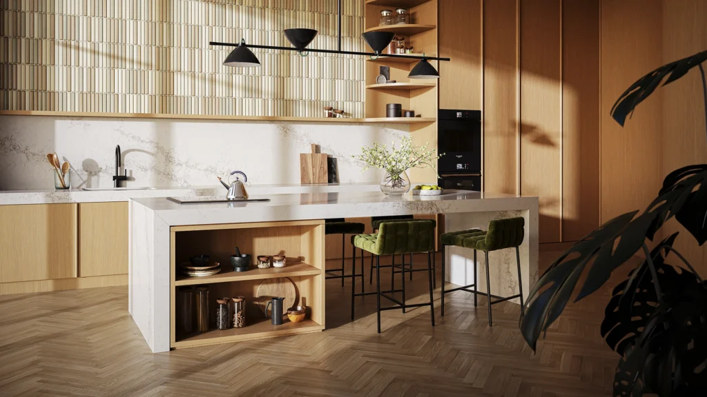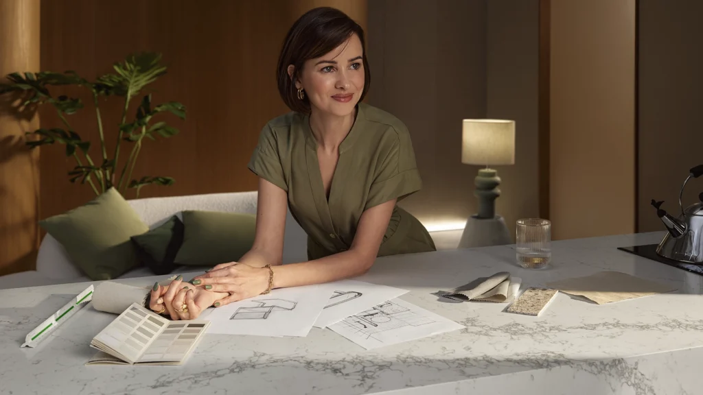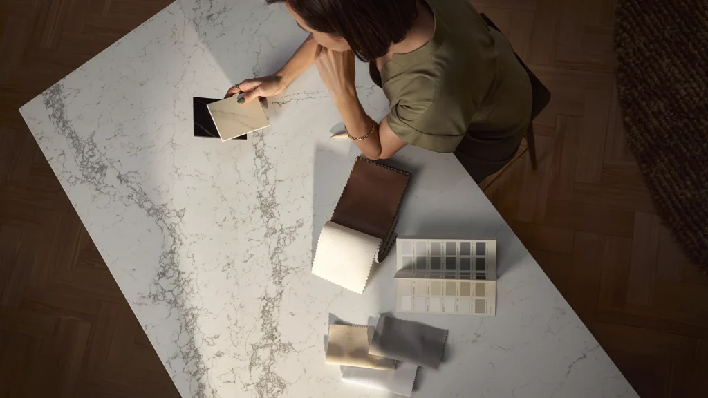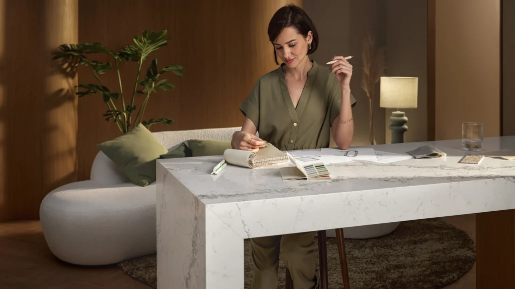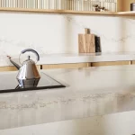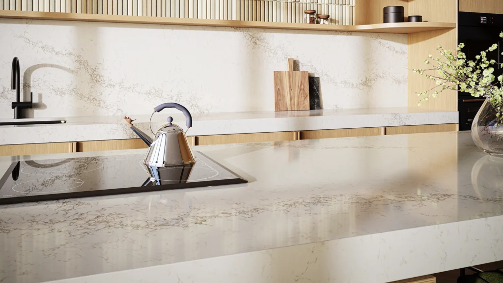 De Caesarstone 5132 Celestial Sky combineert een crèmewitte achtergrond met een levendig, aderachtig web van grijs-, bruin- en groene tinten die organisch in alle richtingen lijken uit te dijen. Deze rijke, natuurlijke textuur voelt alsof hij is vormgegeven door eeuwenlange geologische bewegingen, waarbij elke lijn en kleur subtiel energie en diepte toevoegt. De combinatie van aardse ondertonen met een heldere basis geeft het oppervlak een dynamische, bijna etherische uitstraling die tegelijk warm en verfijnd is. Celestial Sky brengt een gevoel van oerenergie en moderne weelde in je interieur en vormt een prachtig statement in elk ontwerp.