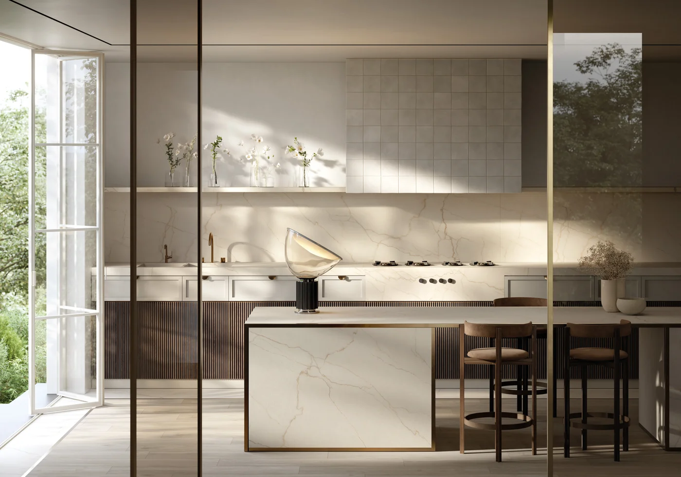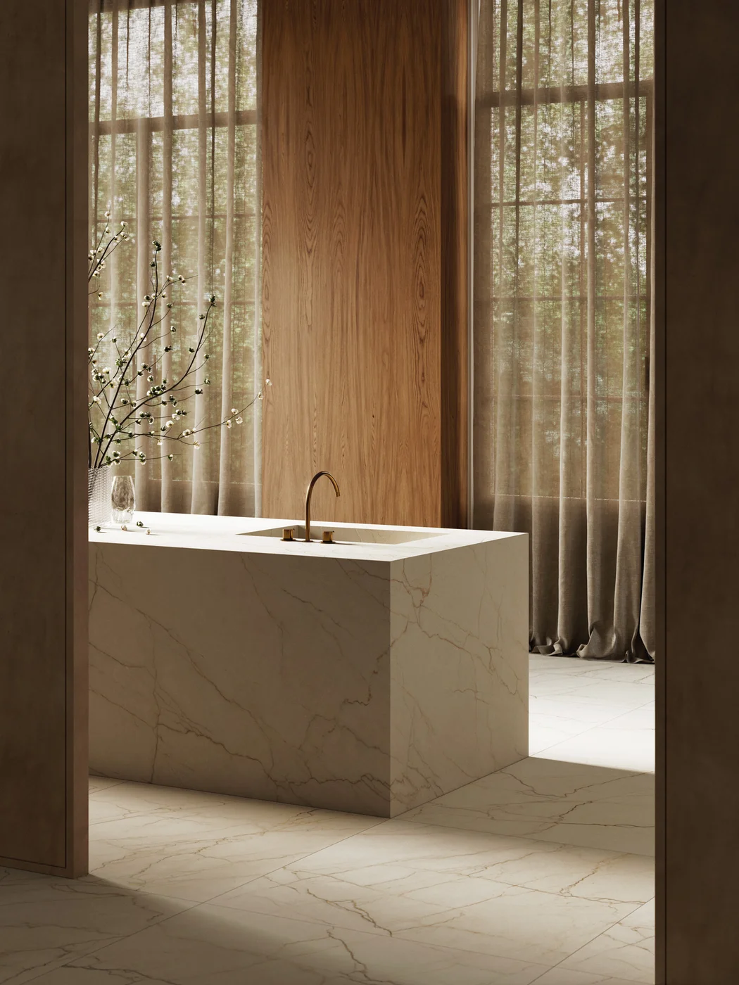 Sapienstone Crema Avorio is een premium porseleinen grootformaat plaat met een crèmewitte achtergrond en subtiel delicate aders in lichtgrijs tot goud, waarmee het de elegantie van traditioneel Italiaans marmer vertaalt naar een duurzaam keramisch oppervlak. Het zachte, warme kleurenspel geeft een rustige, verfijnde uitstraling die perfect past in klassieke en moderne interieurs. Dankzij het grote formaat (320×160 cm) en de hoogwaardige porseleinen samenstelling is Crema Avorio extreem duurzaam, onderhoudsarm, bestand tegen krassen en hitte en ideaal voor werkbladen, vloeren, wanden en maatwerkmeubels in zowel residentiële als commerciële projecten.