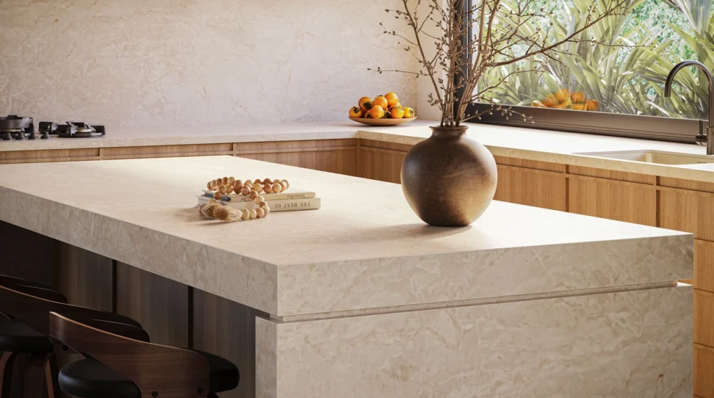 De Caesarstone 583 Crestone combineert een romige taupe basis met golvende beige en witte aders die samen een fijne, vederlichte structuur vormen. Deze subtiele kleuren vloeien elegant in elkaar over en creëren een oppervlak dat zachte beweging en visuele rust uitstraalt. De doorschijnende lichte tinten geven extra diepte en verfijning, waardoor Crestone voelt als een harmonieus samenspel van kleur en textuur. Dit blad voegt een rustgevende, serene sfeer toe aan elke ruimte, ideaal voor interieurs waar natuurlijke elegantie en tijdloze eenvoud centraal staan. Crestone is een warme, uitnodigende keuze die stijl en comfort moeiteloos verenigt.