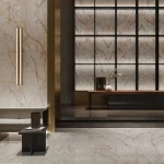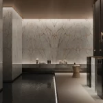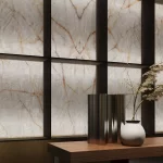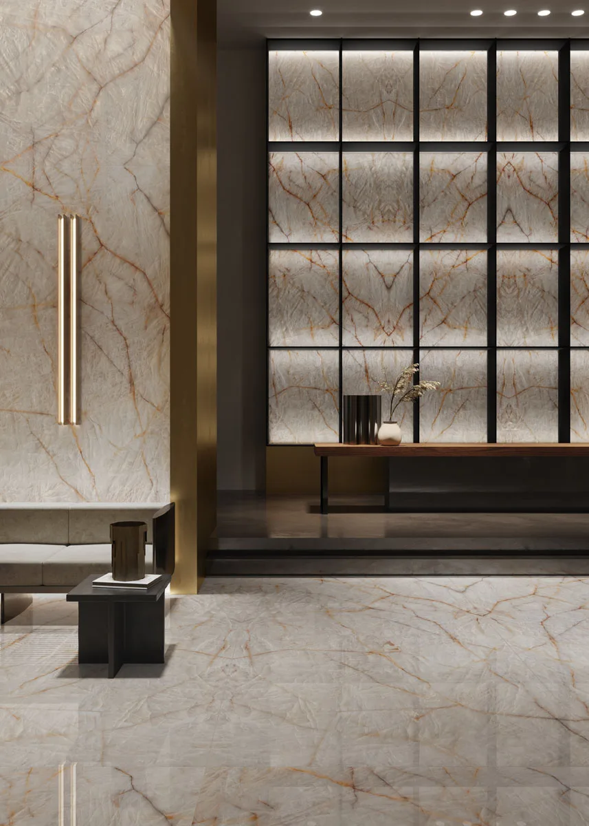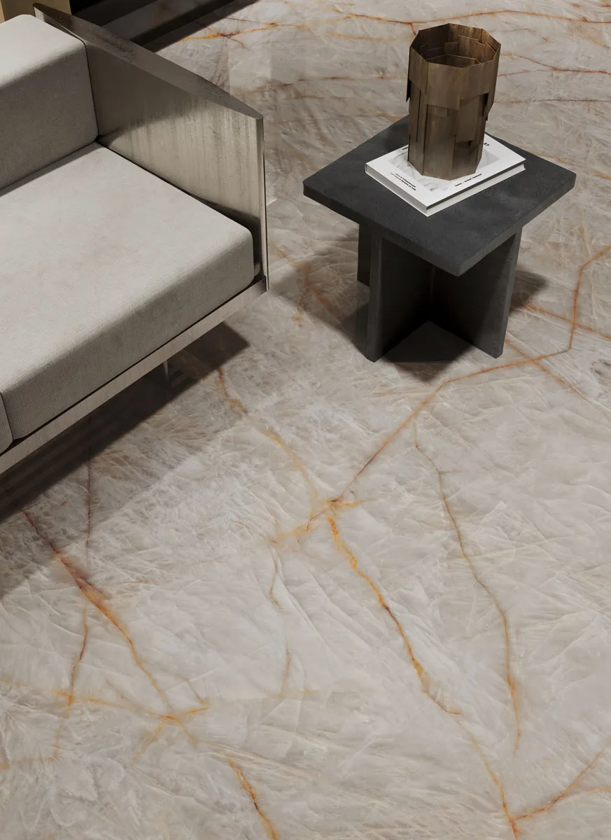 Crystal Clear van Infinity Surfaces is een expressieve porseleinen grootformaat plaat geïnspireerd op de prachtige structuur van kristal, met een helder, ijsachtig oppervlak dat wordt geaccentueerd door vloeiende amberkleurige aders en subtiele lichtreflecties. Deze unieke combinatie van kleur en textuur zorgt voor een drie-dimensionale uitstraling die in wisselend licht verrassende visuele effecten creëert en ruimtes een levendige, elegante sfeer geeft. Dankzij de hoogwaardige porseleinen samenstelling biedt Crystal Clear niet alleen een indrukwekkende esthetiek, maar ook duurzaamheid, onderhoudsgemak en hoge technische prestaties — ideaal voor werkbladen, vloeren, wanden en meubels in zowel luxe residentiële als commerciële projecten.