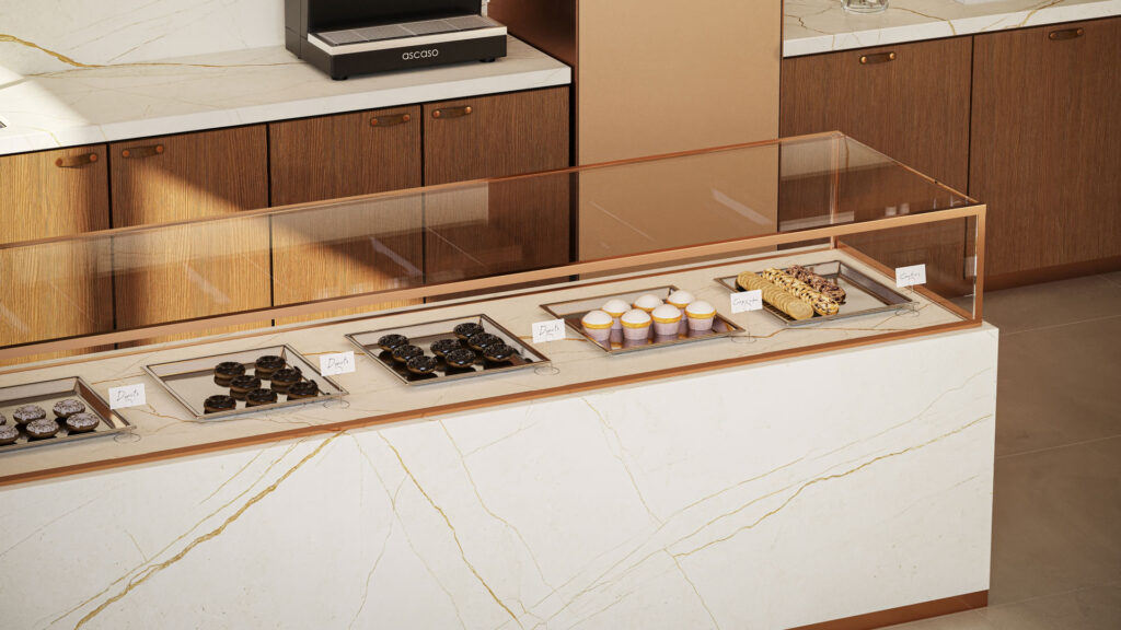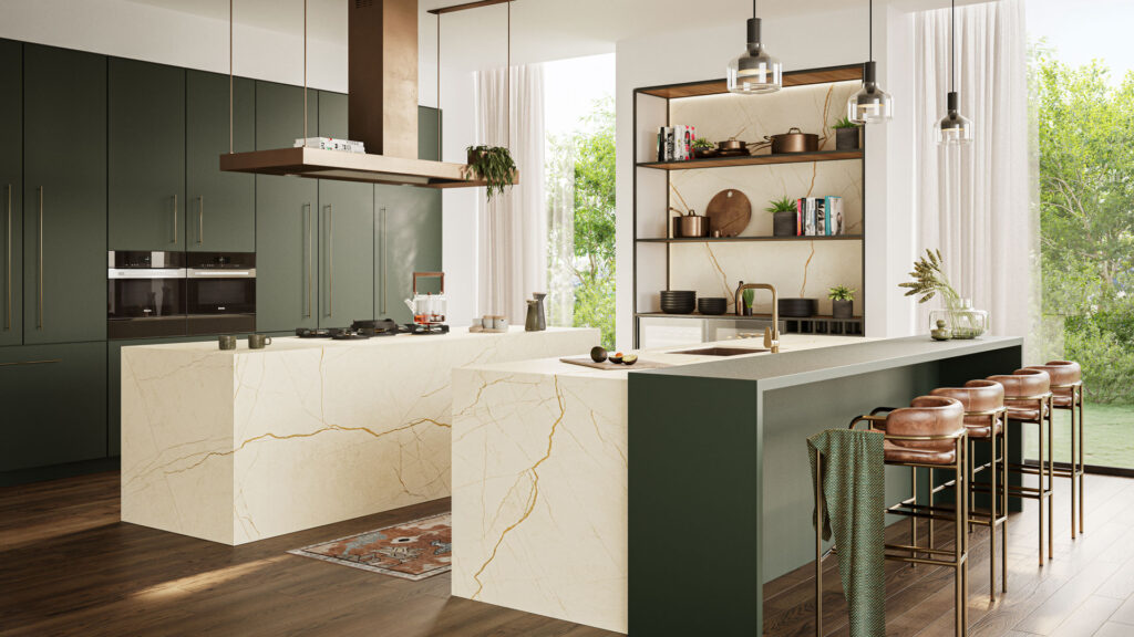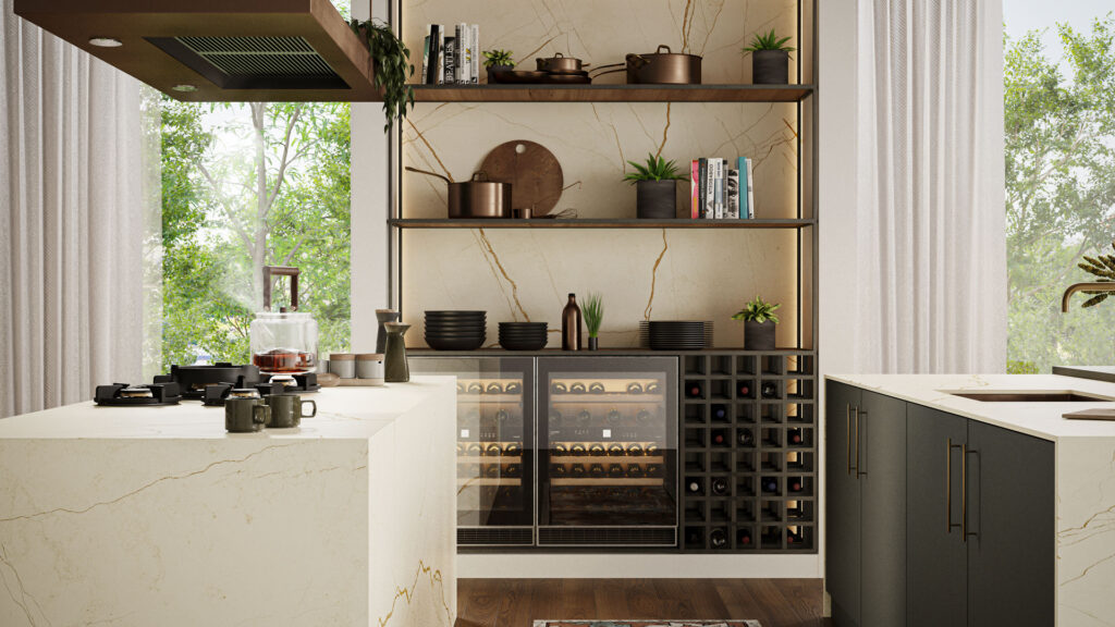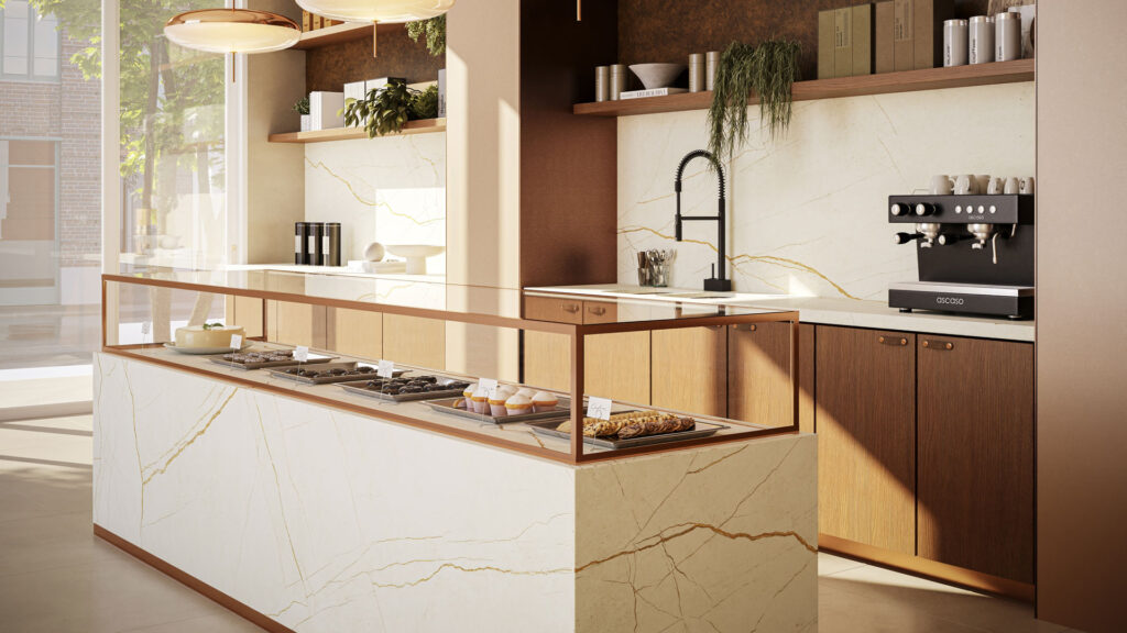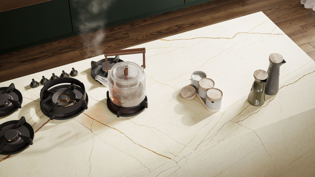 De Caesarstone 508 Isobellia is een spectaculaire interpretatie van tijd en natuur op een neutraal gebroken witte basis die direct de aandacht trekt. Het oppervlak barst van een levendige kriskras van oversized aderen en fijne craquelé-lijnen, verrijkt met een oude koperen deklaag, getextureerde gouden strepen en oer-aardse sedimenten die samen een ongeëvenaarde visuele compositie vormen. Deze dramatische dynamiek voelt tegelijk organisch en kunstzinnig aan, alsof eeuwenoude gesteentelagen voelbaar en zichtbaar zijn geworden in één elegant oppervlak. De slanke, zachte zijde-afwerking geeft een verfijnde textuur die licht subtiel weerkaatst en Isobellia een tijdloze, luxueuze uitstraling schenkt.
