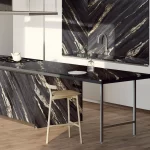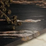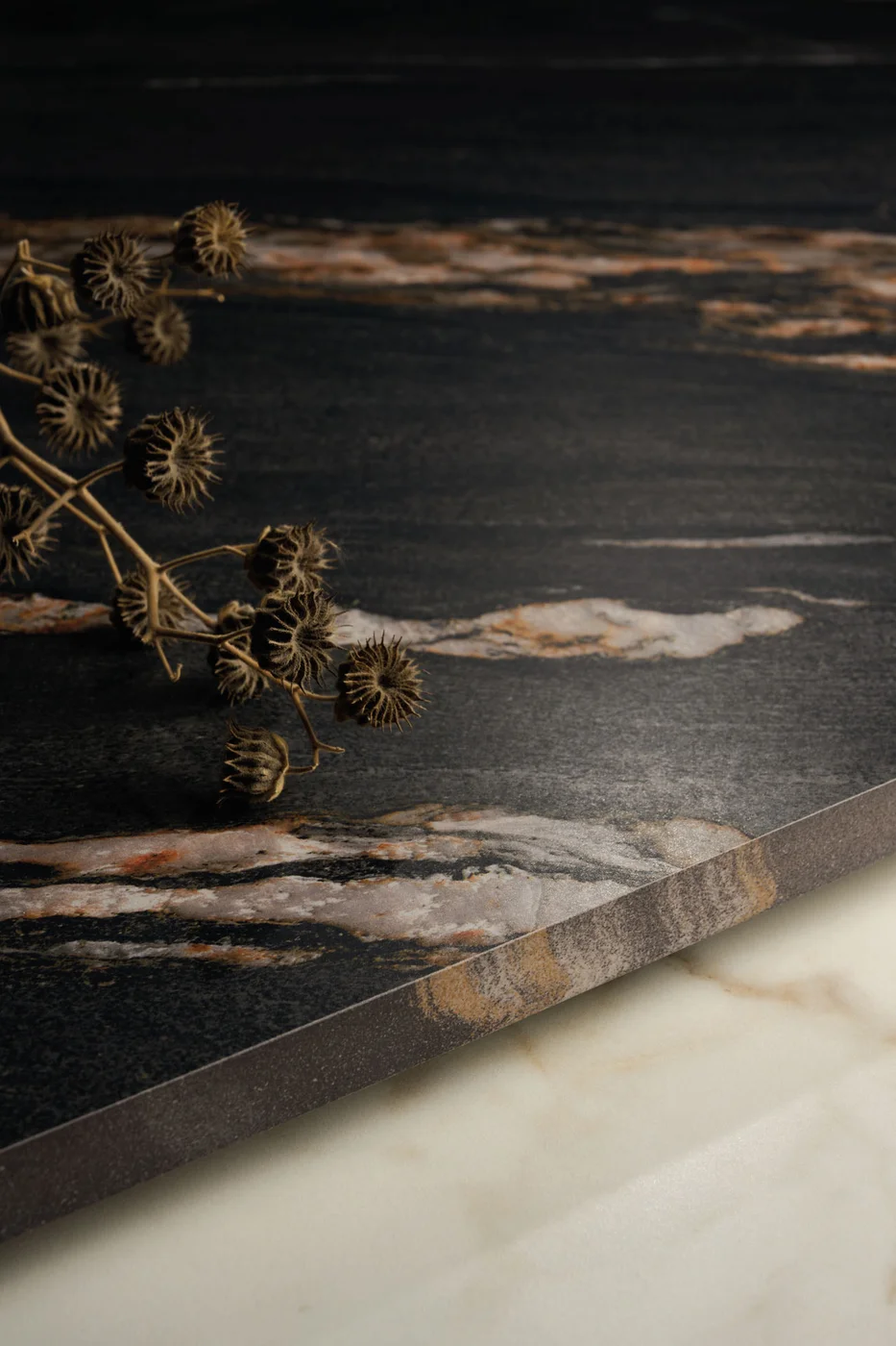 Sapienstone Kuroca 4D is een luxe porseleinen grootformaat plaat met een diepe, expressieve uitstraling waar aders in aardse bruin- en grijstonen vloeiend over een donker oppervlak ‘dansen’ en een dramatisch, karaktervol design creëren. Dankzij de innovatieve 4D “Full Body” technologie lopen de patronen door de volledige dikte van de slab, wat zorgt voor een uitzonderlijk realistische en doorlopende uitstraling — ook aan randen en details en een indrukwekkende visuele continuïteit. De platen zijn verkrijgbaar in cashmere (mat) of gepolijste afwerking en hebben een formaat van ca. 320×160 cm, waardoor ze ideaal zijn voor werkbladen, vloeren, wanden en maatwerkmeubels. Naast de esthetiek biedt Kuroca 4D uitstekende duurzaamheid, onderhoudsgemak en technische prestaties die premium keramiek kenmerken.