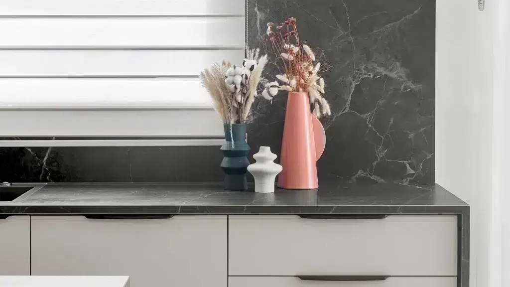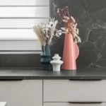 Dit karaktervolle oppervlak combineert diepe grijstinten met warme bruine nuances in een verfijnd en gelaagd geheel. Kleine spikkels en subtiele oxidatie-effecten versterken het natuurlijke karakter en weerspiegelen de esthetische imperfecties van echt natuursteen. Door het oppervlak lopen organische witte aderen, afgewisseld met fijnere kalkachtige lijnen die richting geven en een krachtig visueel accent toevoegen. Deze dynamiek zorgt voor een uitgesproken maar uitgebalanceerde uitstraling met veel diepte. De Honed-afwerking geeft het materiaal een matte, zachte touch en benadrukt de elegante samenhang tussen rauwe expressie en verfijnde luxe.