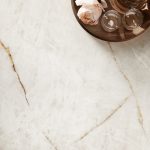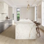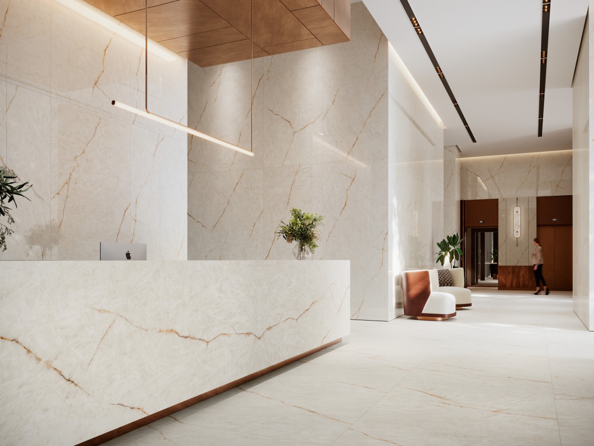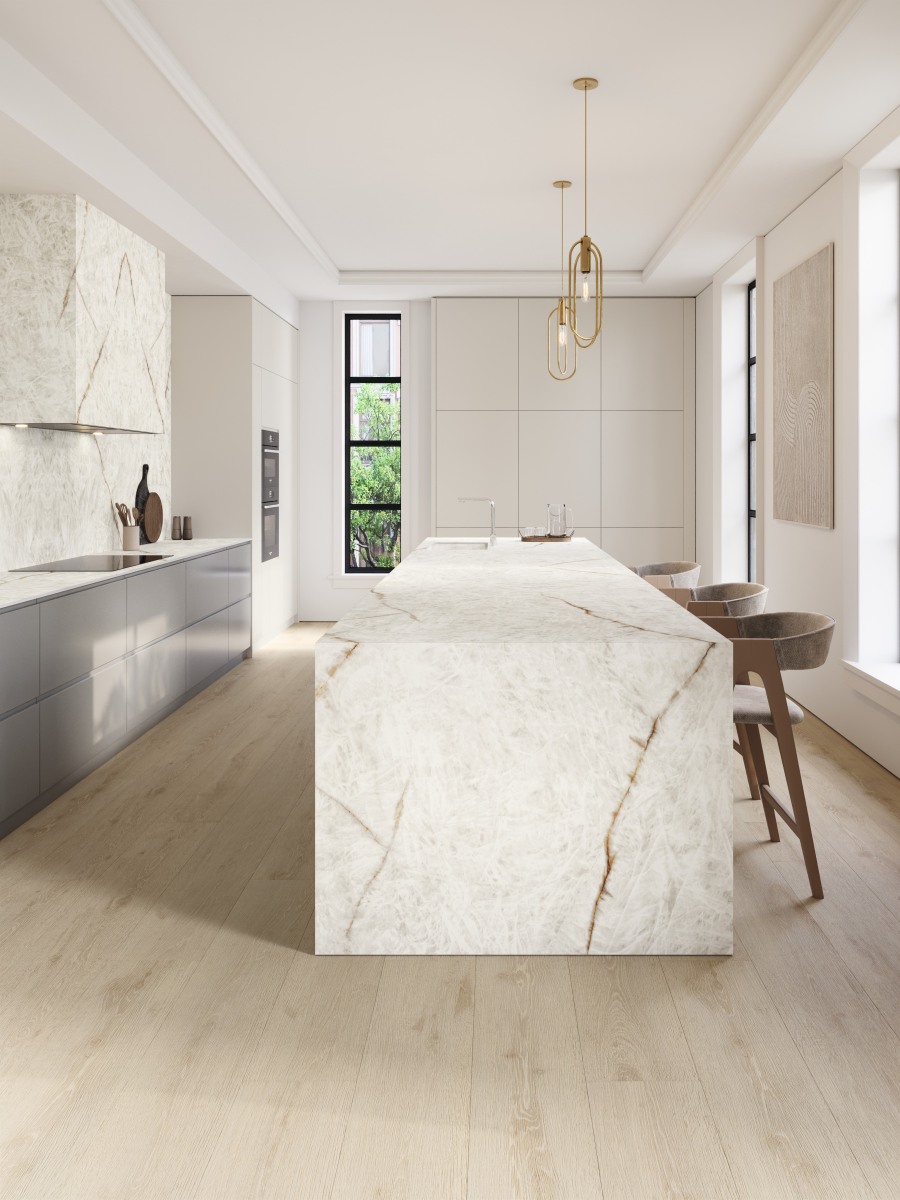 Wat Lumix werkelijk bijzonder maakt, zijn de delicate goudkleurige aders die zich sierlijk over het oppervlak bewegen. Deze warme, glinsterende insluitsels zorgen voor een verrassend polychromatisch effect, waarbij elke plaat een unieke dynamiek en luxueuze intensiteit uitstraalt. De combinatie van kristalachtige diepte en goudnuances maakt Lumix ideaal voor hoogwaardige interieurs — van moderne keukens en badkamers tot exclusieve commerciële projecten — waar een verfijnde, stralende en tegelijkertijd moderne esthetiek gewenst is.