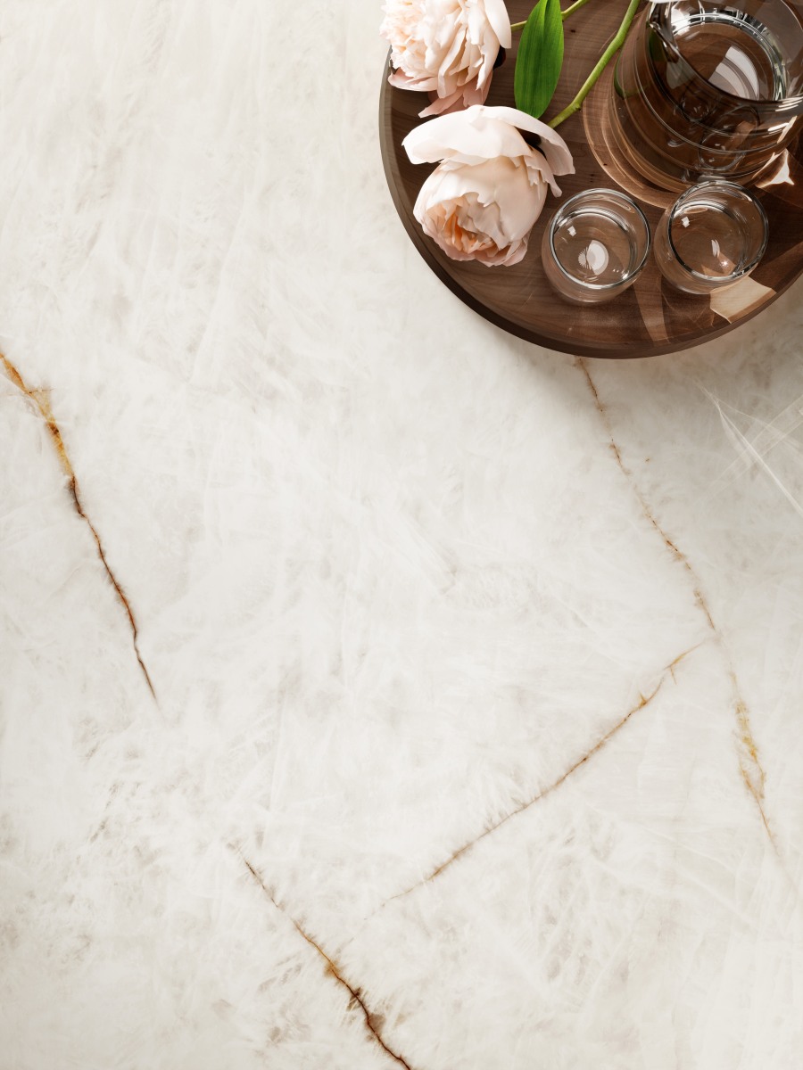 Lumix, geïnspireerd op de zuivere schoonheid van kwartscristal, weet op verbluffende wijze de transparantie, lichtdiepte en gelaagdheid van dit edelachtige materiaal te reproduceren. Het oppervlak toont een verfijnde visuele diepte die doet denken aan natuurlijke kristalstructuren, waarbij licht subtiel wordt gevangen en weerkaatst. Door deze kristallijne uitstraling krijgt Lumix een bijna etherisch karakter dat ruimtes direct verrijkt met helderheid en elegantie.