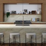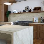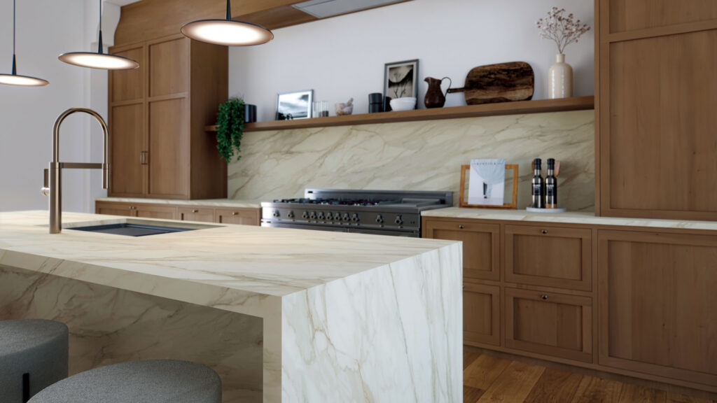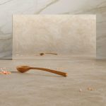 Dit verfijnde oppervlak toont een zachte ivoren basis waarin tinten van gewassen klei subtiel samensmelten tot een krachtige, metamorfe structuur. Brede aderen in antraciet en grijs bewegen als zwevende wolken over het materiaal en worden elegant geaccentueerd door warme koperkleurige nuances. Deze gelaagde compositie creëert een indrukwekkende diepte die doet denken aan massief marmer, gecombineerd met de lichte transparantie van albast. De Honed-afwerking versterkt het matte, fluweelachtige karakter en geeft het oppervlak een rustige, luxueuze uitstraling. Perfect voor interieurs waarin exclusiviteit, diepte en natuurlijke elegantie centraal staan.