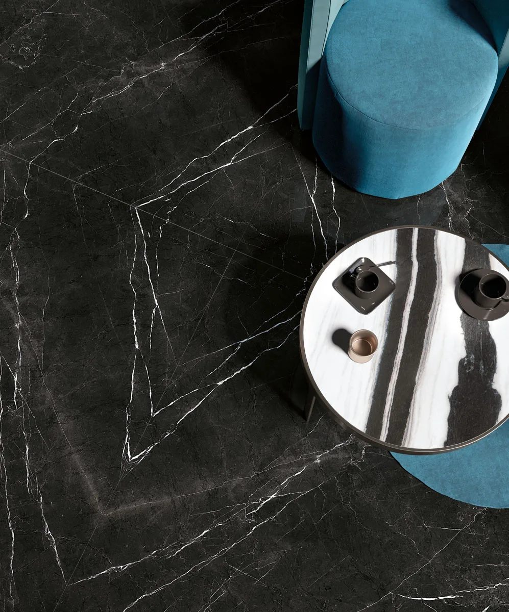 Nero Marquinia van Infinity Surfaces is een spectaculaire porseleinen grootformaat plaat geïnspireerd op het iconische zwarte marmer met krachtige, contrasterende witte aders die een diepe, elegantie uitstraling geven aan elk interieur. Deze designplaat combineert de tijdloze allure van natuursteen met de technische voordelen van premium keramiek, waaronder hoge kleurintensiteit, kras- en vlekbestendigheid en eenvoudig onderhoud. De intense zwarte achtergrond en lichte adertekening creëren indrukwekkende licht- en schaduweffecten die ruimtes karakter en diepte geven. Nero Marquinia is ideaal voor werkbladen, vloeren, wanden en meubels in zowel luxe residentiële als stijlvolle commerciële projecten.