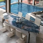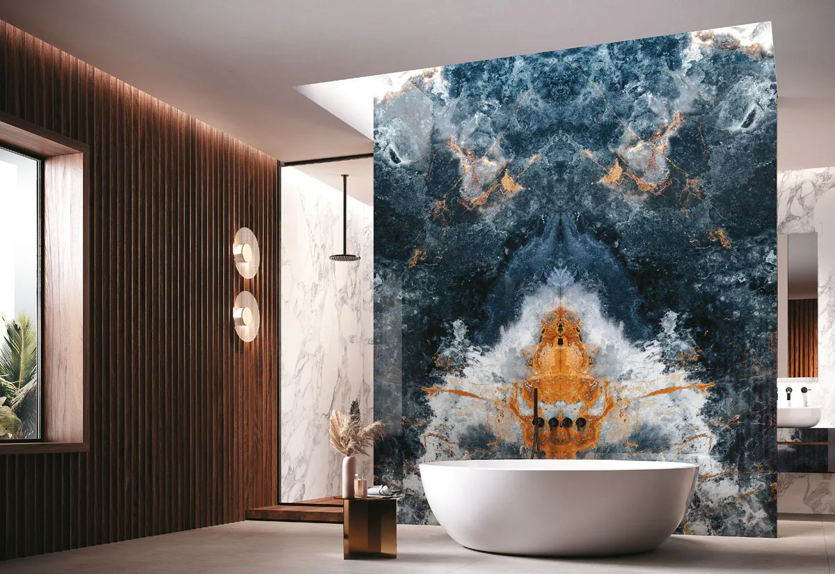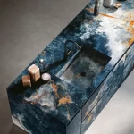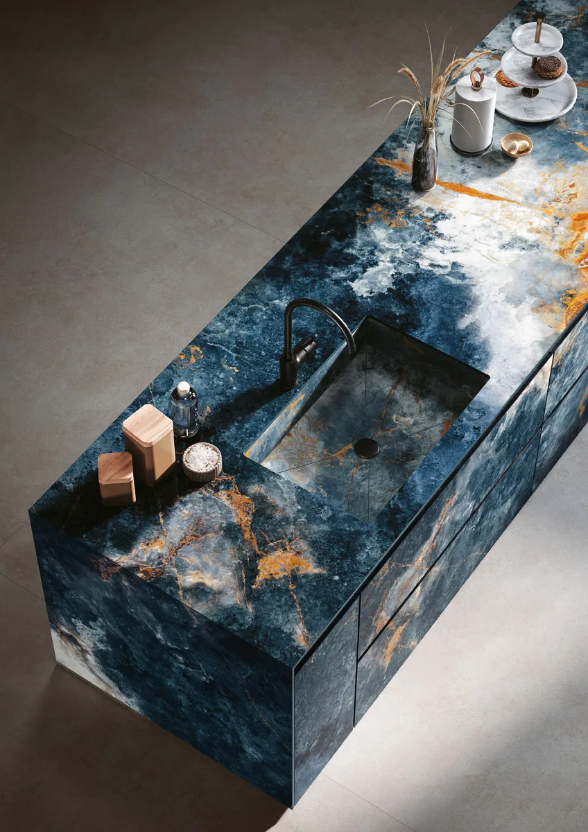 Ocean Blue van Infinity Surfaces is een spectaculaire porseleinen grootformaat plaat geïnspireerd op de prachtige diepte en beweging van oceaanwater, met intense blauw- en aquatinten en natuurlijke aders die doen denken aan de vloeiende patronen van onyx. Dit design creëert een visueel dramatisch en luxueus oppervlak dat perfect past bij stijlvolle, hedendaagse interieurs en architecturale toepassingen. Dankzij de hoogwaardige ceramische samenstelling biedt Ocean Blue niet alleen een bijzondere esthetiek, maar ook uitstekende duurzaamheid, kleurvastheid en onderhoudsgemak, waardoor het ideaal is voor werkbladen, vloeren, wanden en meubels in zowel residentiële als commerciële projecten.