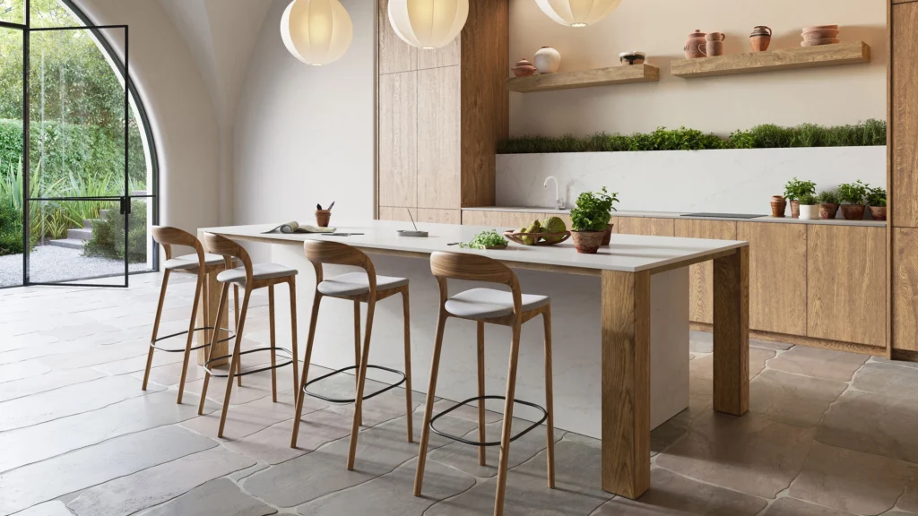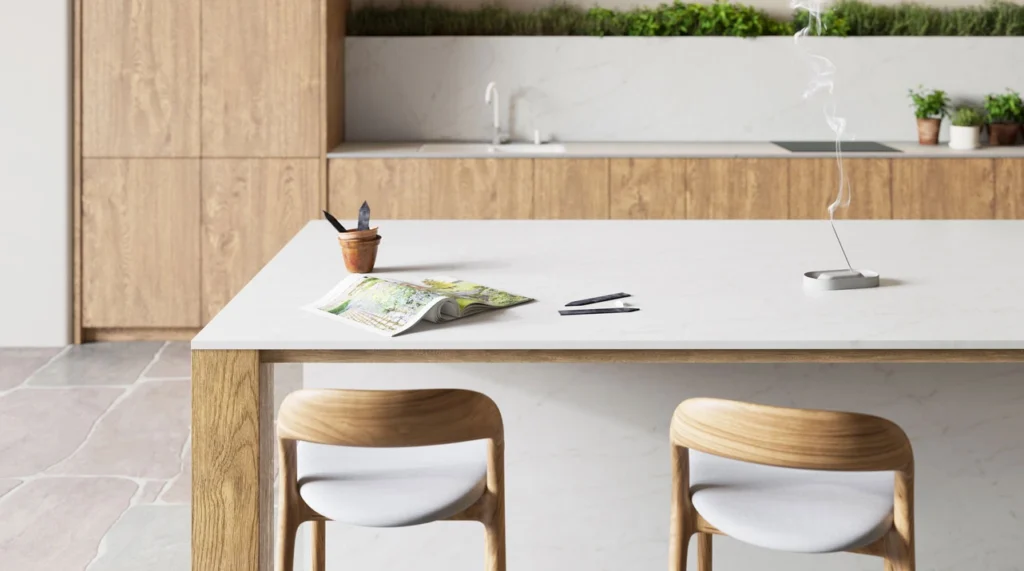 De Caesarstone 8477 Ocean Sage vangt de essentie van een diepzee-landschap met een donkere, bijna mystieke basis die doet denken aan oceaanwater op z’n diepst. Romig schuim en donkere zeewieraders vloeien organisch door het oppervlak en vervagen geleidelijk in rokerige grijstinten, wat een levendig, natuurlijk patroon creëert. Deze textuur geeft elke ruimte een verfijnde, natuurlijke energie die zowel rust als karakter toevoegt. Ocean Sage voelt tegelijk krachtig en elegant aan, en past moeiteloos in moderne en traditionele interieurs. Het resultaat is een intrigerend oppervlak dat visuele diepte combineert met tijdloze stijl.