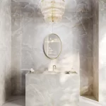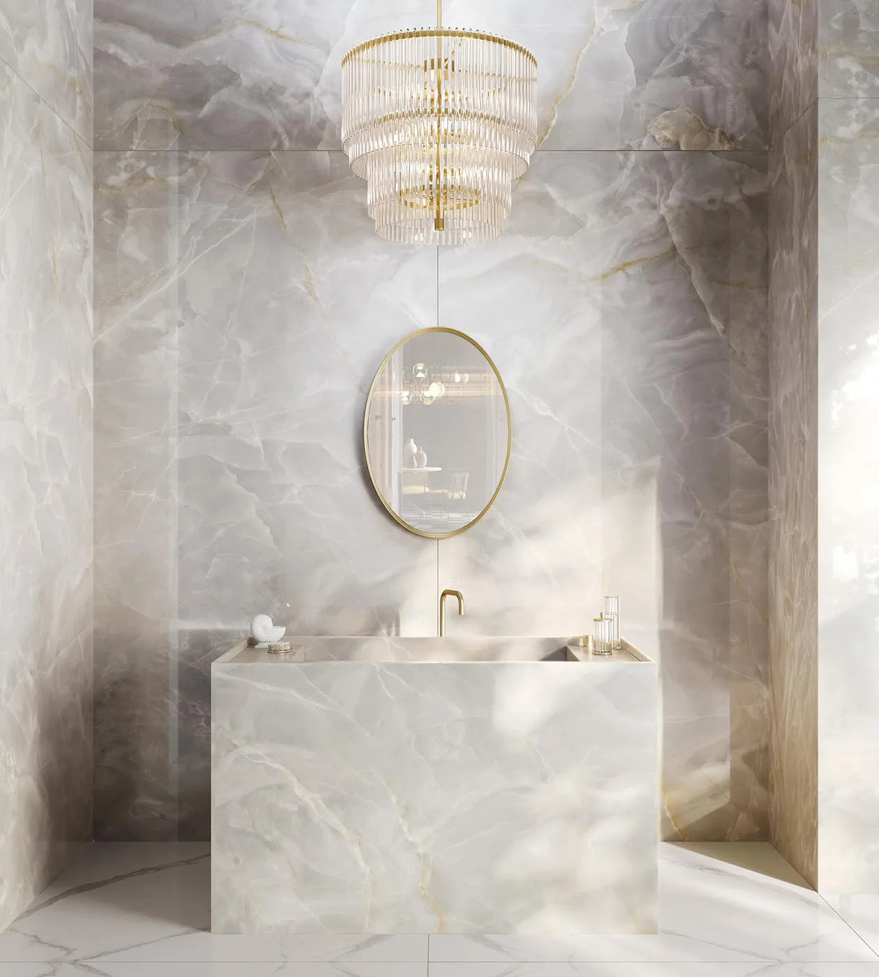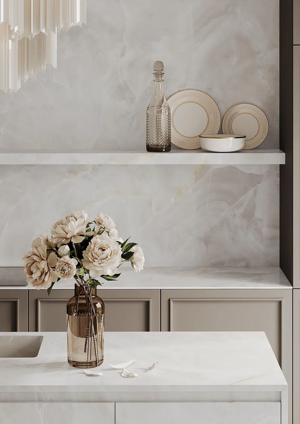 Onyx White van Infinity Surfaces is een porseleinen grootformaat plaat die de tijdloze elegantie en subtiele transparantie van wit onyx prachtig vertaalt naar een verfijnd keramisch oppervlak. Deze collectie staat bekend om zijn heldere, parelachtige witte basis, die serene, lichtreflecterende ruimtes creëert en harmonieert met uiteenlopende interieurstijlen. Onyx White combineert ondersteboven luxe esthetiek met de technische prestaties van premium porselein — zoals duurzaamheid, onderhoudsgemak en weerstand tegen krassen en vlekken — waardoor het perfect geschikt is voor werkbladen, vloeren, wanden en maatwerkmeubels in zowel residentiële als commerciële projecten.