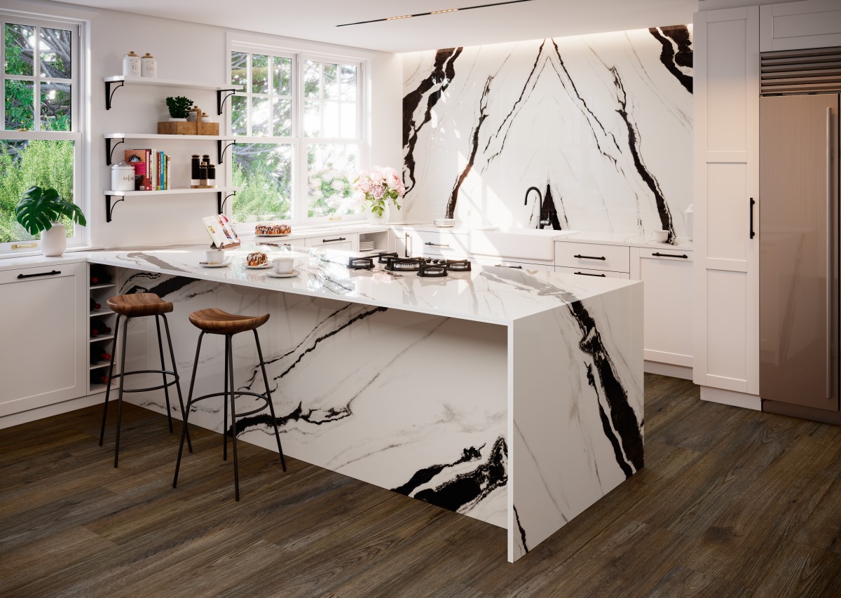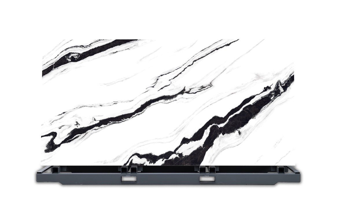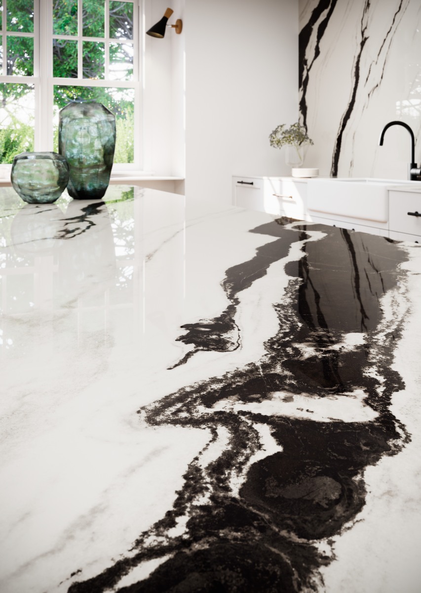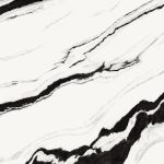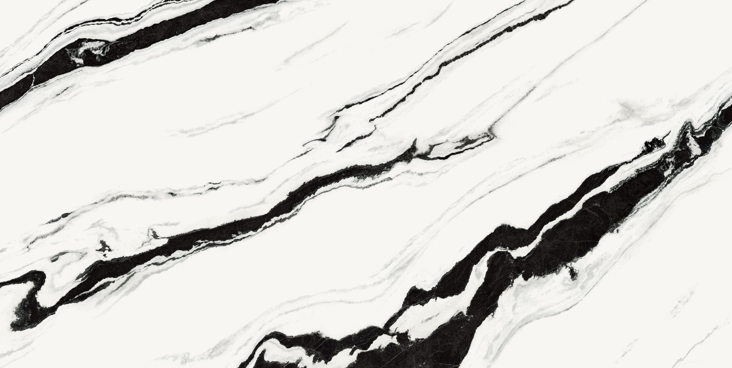 De spectaculaire uitstraling van Panda ontstaat door het krachtige contrast tussen de diepe zwarte aders en de zuiver witte achtergrond. Dit opvallende kleurenpalet doet denken aan de markante vachttekening van een panda, waaraan het materiaal zijn naam te danken heeft. De intense zwart-witcombinatie creëert een visueel statement dat zowel modern als tijdloos is. De helderheid van het wit en de intensiteit van de donkere lijnen zorgen samen voor een dynamisch en verfijnd oppervlak dat onmiddellijk de aandacht trekt.