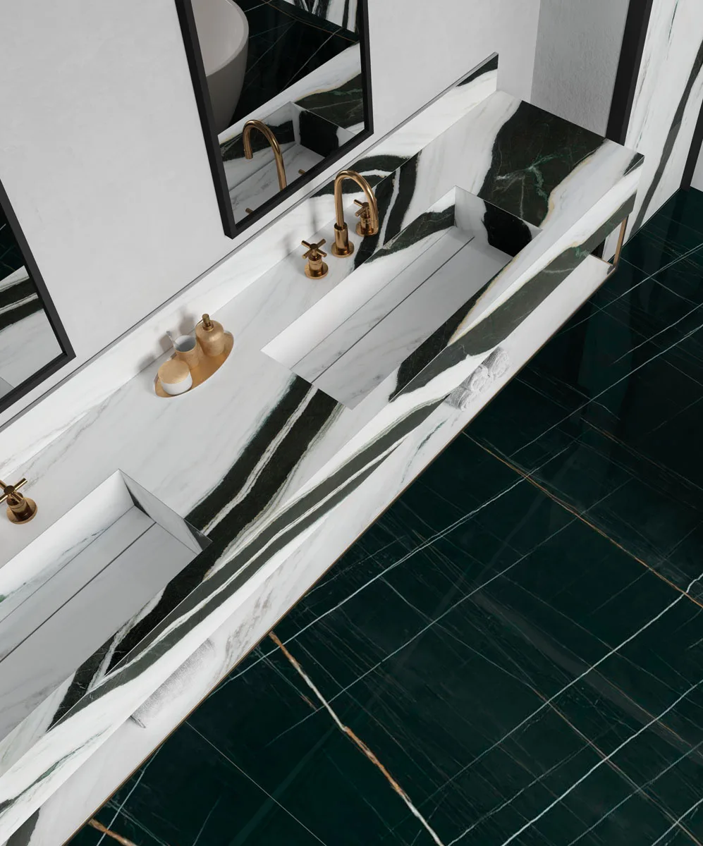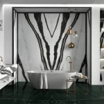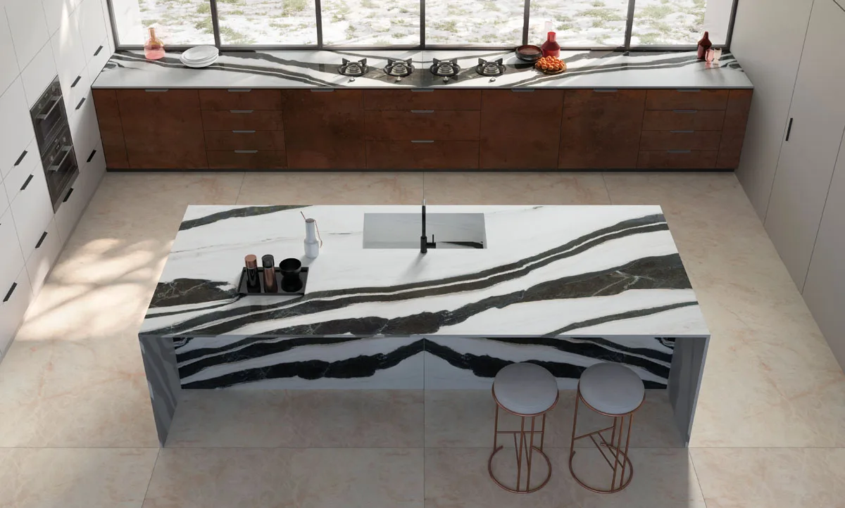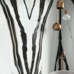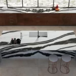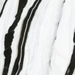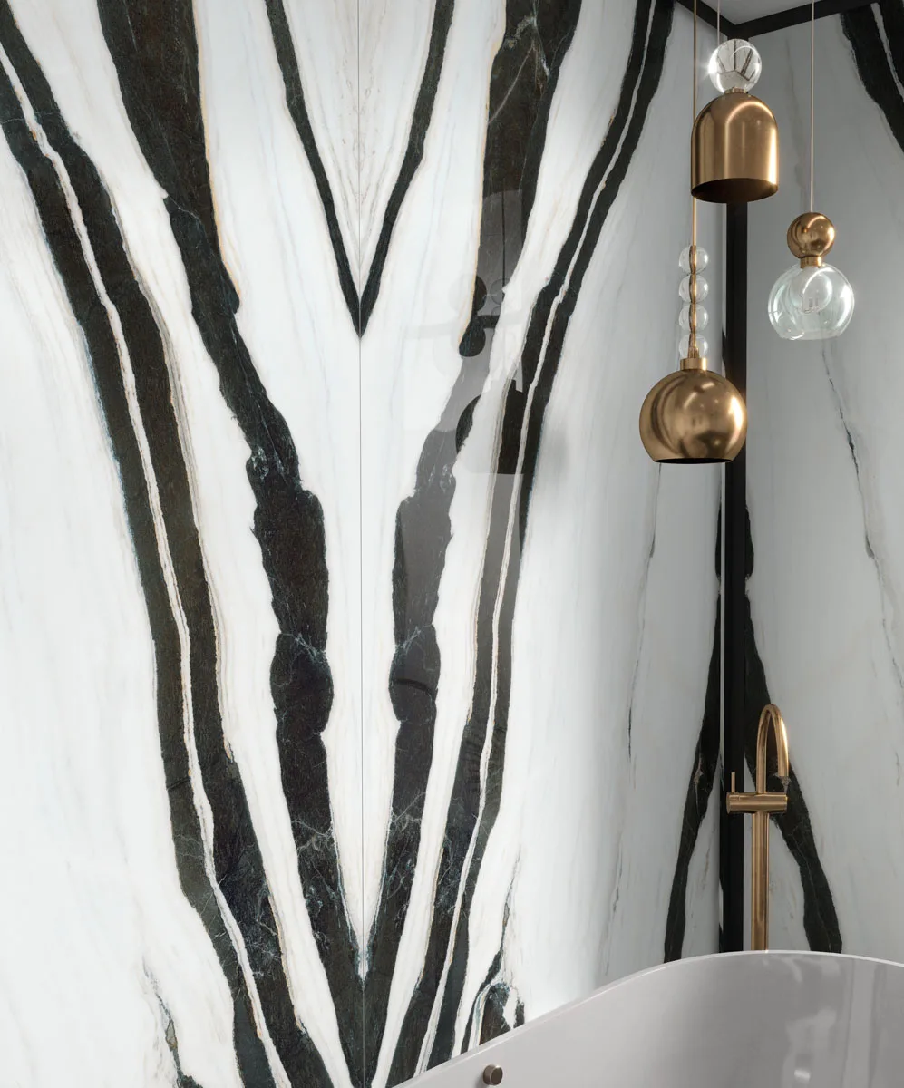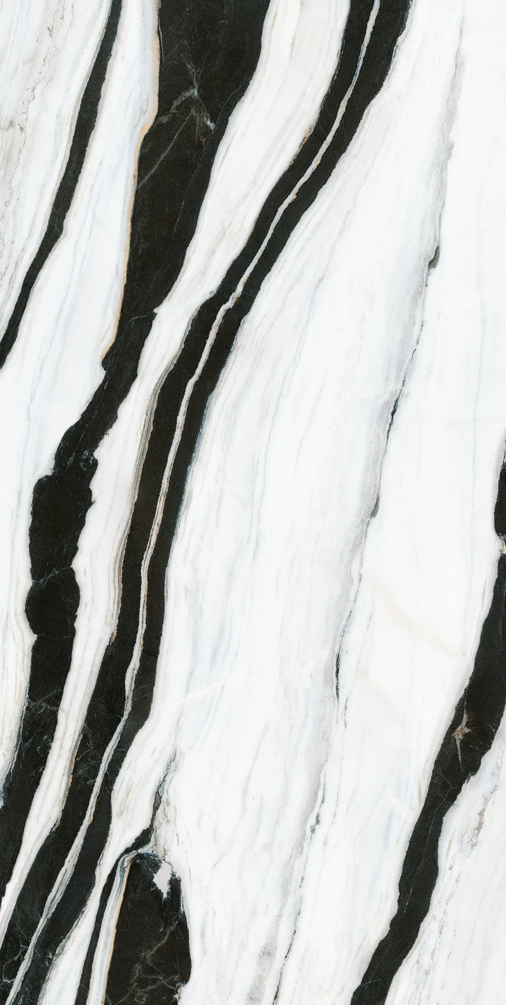 Panda White van Infinity Surfaces is een iconische porseleinen grootformaat plaat met een strak, puur witte achtergrond en krachtige zwart-grafische aders die doen denken aan het beroemde Panda-marmer — een opvallend contrast dat modern design extra karakter geeft. Dit materiaal combineert de luxe uitstraling van natuursteen met de duurzamere technische eigenschappen van premium keramiek: het is slijtvast, kras- en hittebestendig en eenvoudig schoon te houden. Panda White is ideaal voor werkbladen, vloeren, wanden en meubels in zowel residentiële als commerciële projecten waar een strak, visueel statement gewenst is.