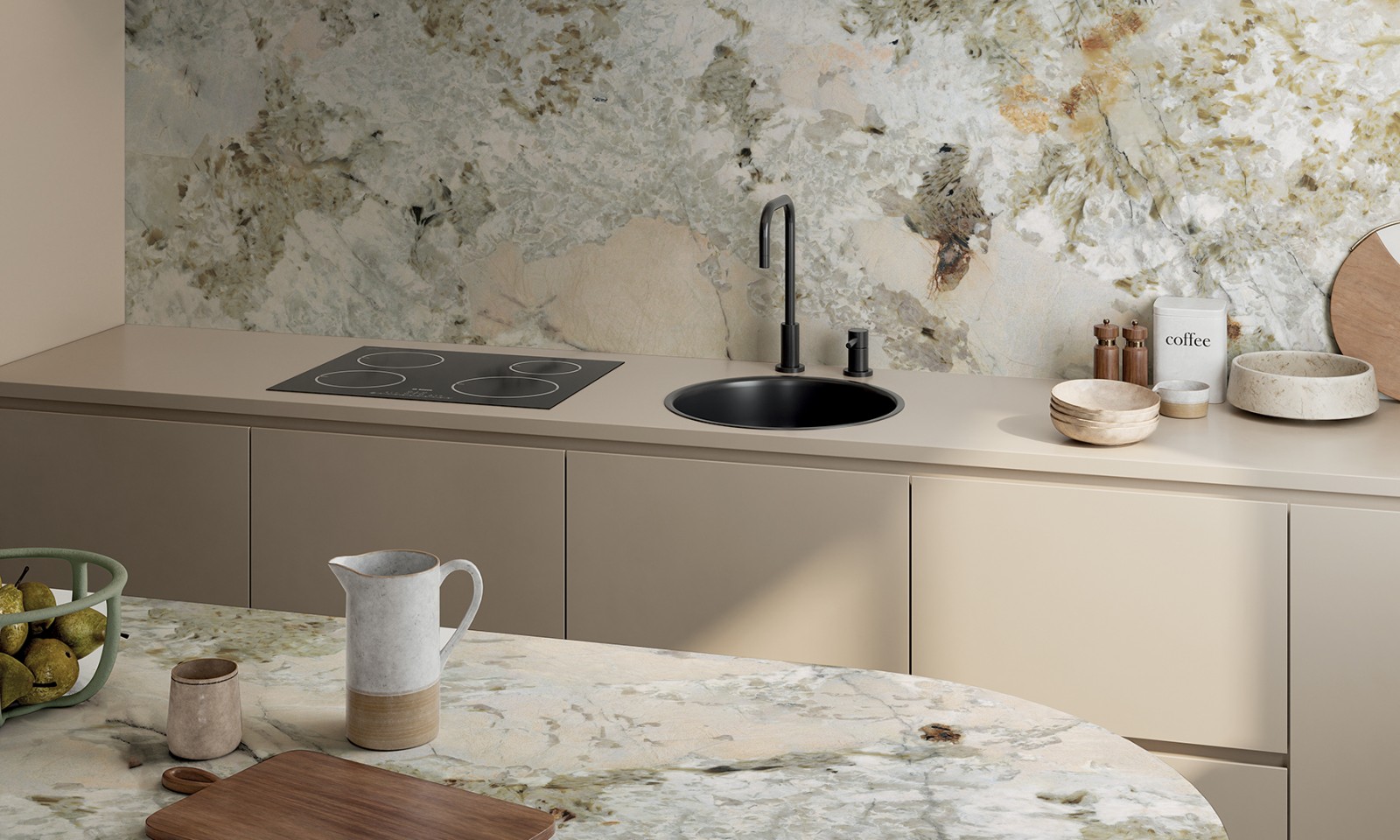 Patagonia Wow belichaamt de schoonheid van natuursteen met een theatrale twist. De slab wekt de indruk van marmer met dramatische aders en kleurcontrasten, op een formaat van 1635 × 3230 mm, wat zorgt voor een indrukwekkend visueel effect zonder zichtbare voegen. Je kunt kiezen uit twee afwerkingen: de subtiele SOFT en de luxueuze LUX, die beide de structurele diepte en textuur krachtig tot uitdrukking brengen