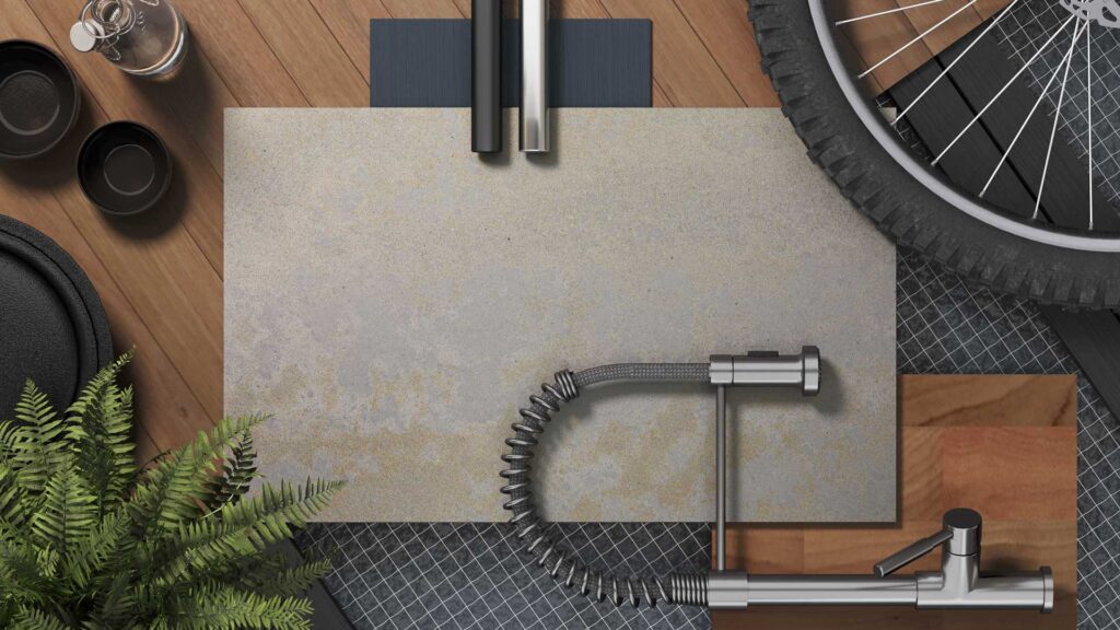 De Caesarstone 4043 Primordia heeft een lichte, betonkleurige basis die zich moeiteloos ontvouwt als een canvas van subtiele nuances. Over dat rustige fundament liggen minerale vlekken van gebroken wit en sluiers van grijs, die samen een organisch en gelaagd patroon vormen. Door verweerde accenten van geoxideerd roest en gewassen tinten krijgt het oppervlak een aardse, natuurlijke dynamiek, terwijl vage gele en gewassen groene sporen extra diepte en visuele interesse toevoegen. Dit alles maakt Primordia tot een intrigerende en veelzijdige keuze die warmte, karakter en tijdloze elegantie combineert.