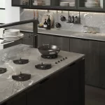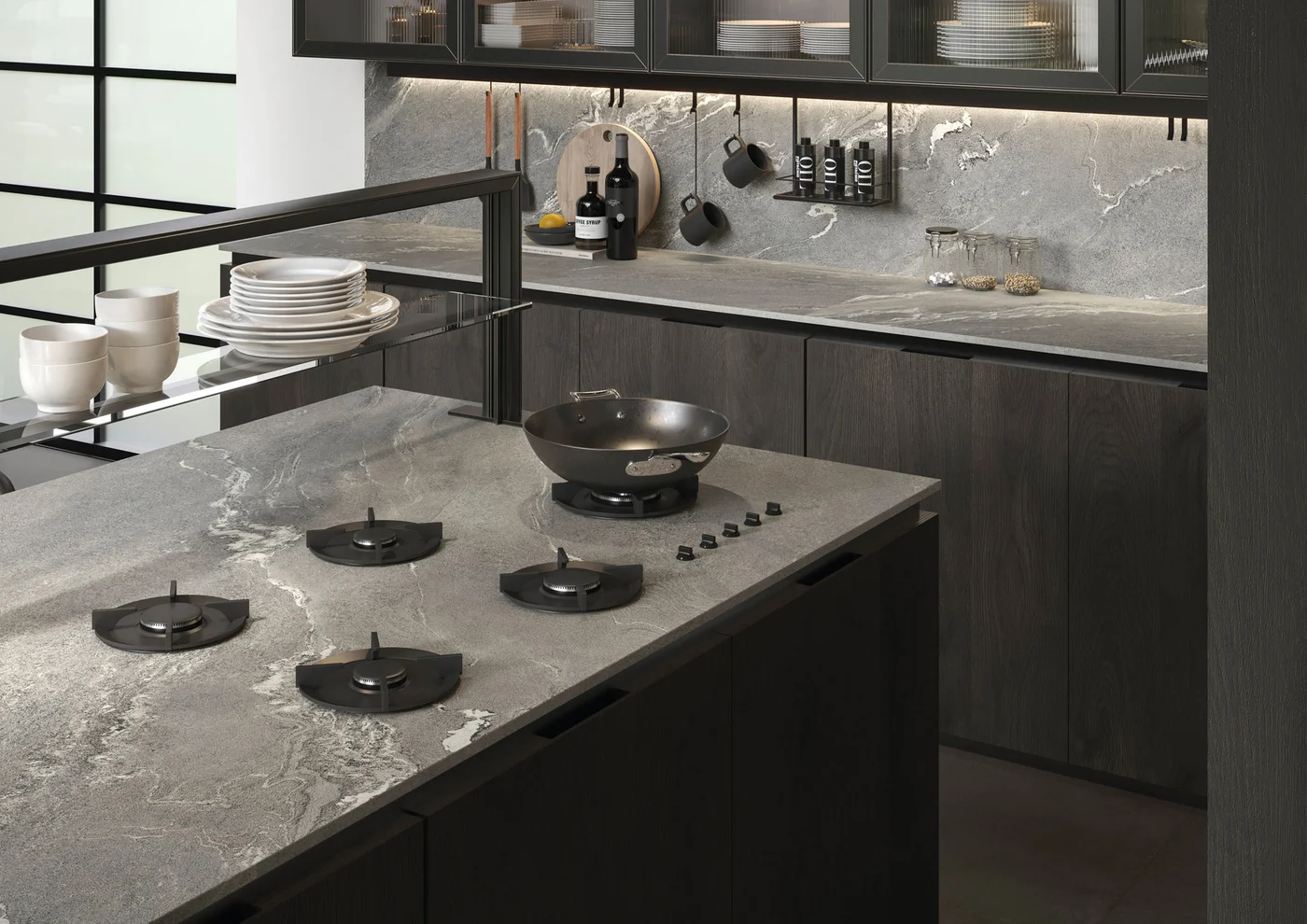 Sapienstone Quarzite Vals is een porseleinen grootformaat plaat geïnspireerd op hoogwaardige kwartsiet-natuursteen, met een rustige grijs-crème basis verrijkt met subtiele aders en minerale accenten die zorgen voor een natuurlijke, gelaagde structuur. De organische textuur en zachte kleurnuances creëren een serene en tijdloze uitstraling die uitstekend past in moderne, minimalistische en luxueuze interieurontwerpen. Dankzij de premium porseleinen samenstelling is Quarzite Vals duurzaam, onderhoudsvriendelijk en resistent tegen krassen, hitte en vlekken — ideaal voor intensief dagelijks gebruik. Met grote formaten (tot ca. 320×160 cm) leent dit materiaal zich perfect voor werkbladen, vloeren, wanden en maatwerkmeubels in zowel residentiële als commerciële projecten.