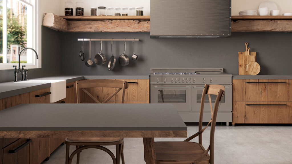 De Caesarstone 1003 Raindream combineert twee lagen leigrijs die subtiel worden geaccentueerd door zachte donkergrijze strepen en verfijnde neutrale accenten. Dit samenspel van tinten creëert een rijke visuele textuur die doet denken aan natuurlijk gevormde stenen. De Polished-afwerking versterkt deze esthetiek door het oppervlak een glanzende, bijna natte uitstraling te geven, vergelijkbaar met een riviersteen die net door stromend water is gepolijst. Raindream voegt een moderne, maar toch organische charme toe aan keukens en woonruimtes en zorgt voor een elegante, tijdloze achtergrond in elk interieur.
