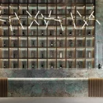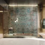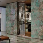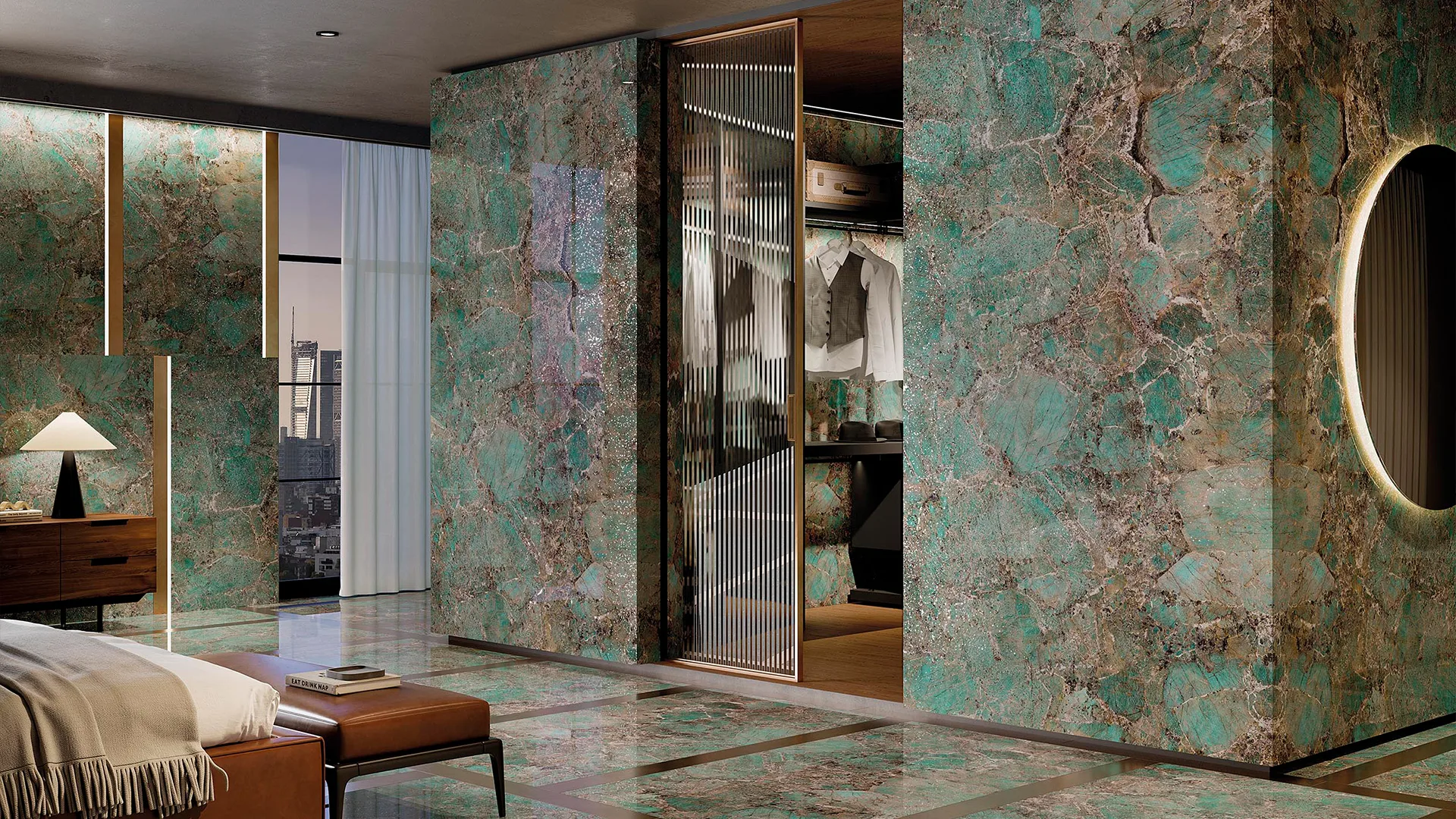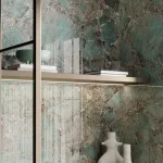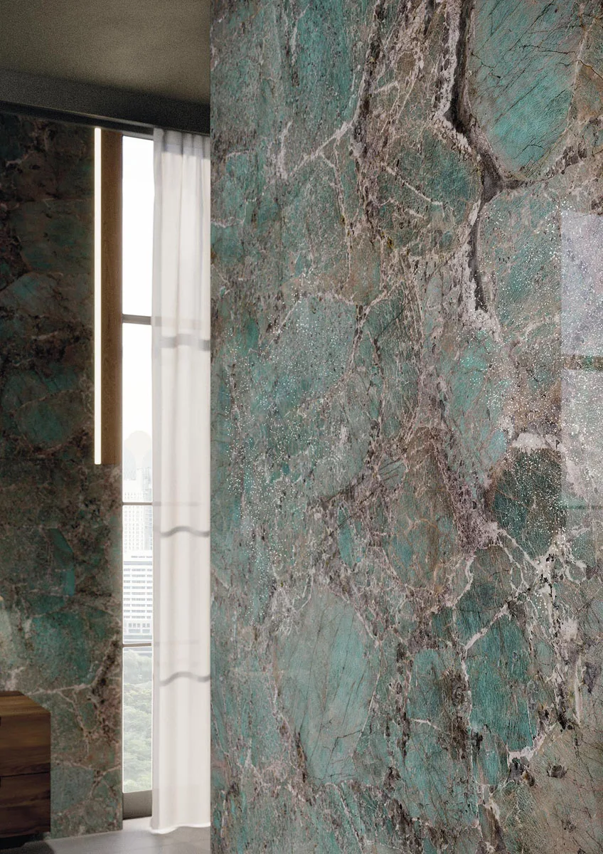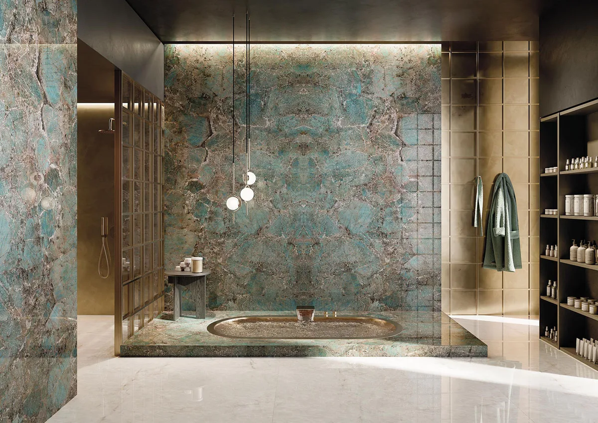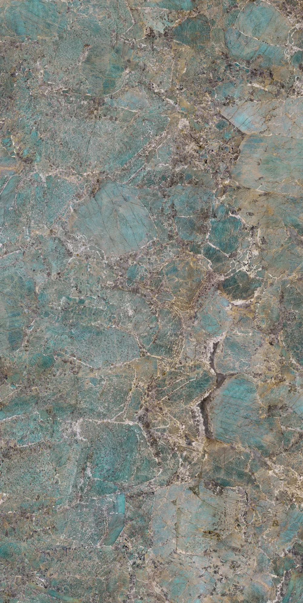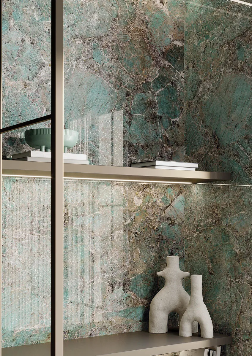 Santos van Infinity Surfaces is een indrukwekkende porseleinen grootformaat plaat met een rijke, diepe groene basis die wordt geaccentueerd door warme, gouden en honingkleurige aderen, geïnspireerd op de translucente schoonheid van onyx en gewaardeerd om zijn scenografische, luxueuze uitstraling. Deze keramische oppervlakte creëert elegante lichtreflecties en geeft ruimtes een verfijnde, artistieke sfeer — ideaal voor exclusieve interieurtoepassingen zoals werkbladen, vloeren, wanden en maatwerkmeubels. Dankzij de hoogwaardige porseleinen samenstelling biedt Santos niet alleen een opvallend design, maar ook uitstekende duurzaamheid, onderhoudsgemak en technische prestaties voor hoogwaardige projecten.