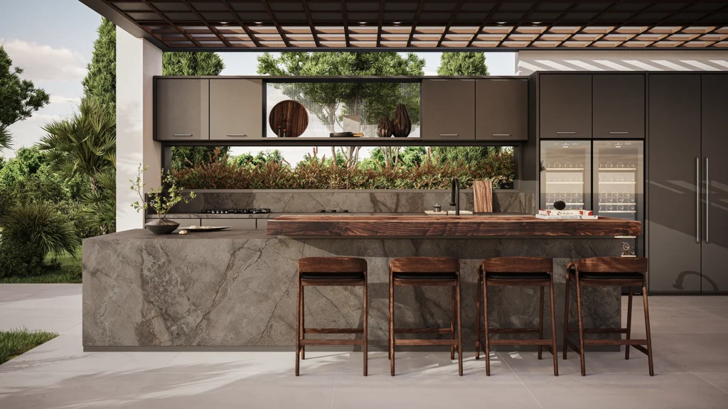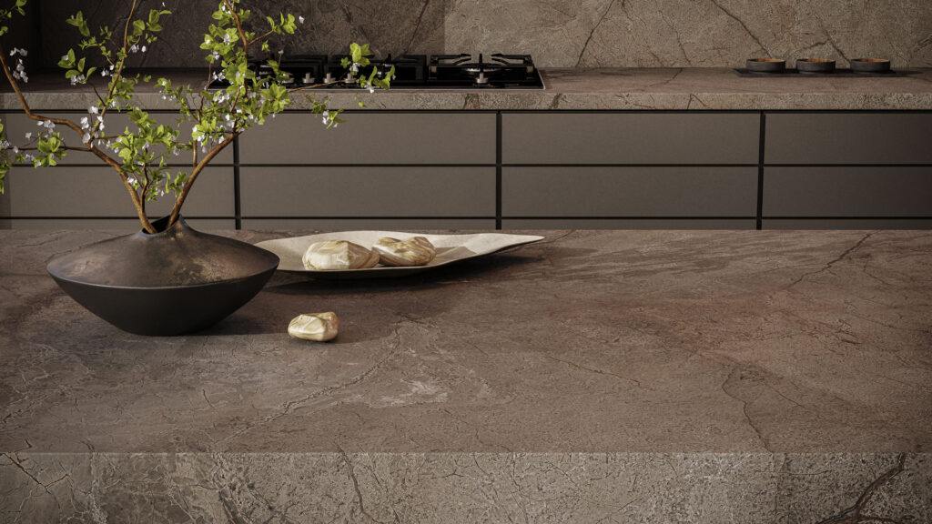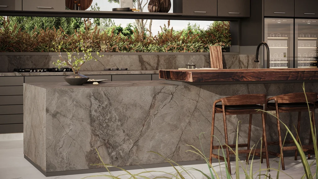 De Caesarstone 910 Silver River straalt luxe uit met een diepe, warme grijstint die krachtig en toch ingetogen oogt. Over deze elegante basis slingeren subtiele goudbruine aders, die een rijk contrast vormen tussen koele metallic grijstinten en warme, aardse nuances. Dit samenspel creëert een vloeiende, natuurlijke esthetiek waarin licht en textuur in harmonie werken, wat het oppervlak een verfijnde, bijna levendige uitstraling geeft. Silver River voegt karakter en elegantie toe aan moderne en klassieke interieurs en is een stijlvolle keuze voor wie warmte en diepte in het design wil combineren.