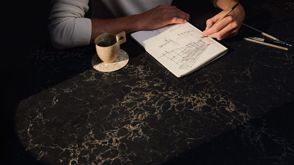 De Caesarstone 5100 Vanilla Noir straalt een rijke en luxueuze uitstraling uit met een diepe, ebbenhouten basis die kracht en elegantie combineert. Over dit donkere, verfijnde canvas lopen uitlopende aderen van crème vanille, die het geheel visueel verrijken en een prachtig contrast vormen tussen licht en donker. Deze gedurfde persoonlijkheid geeft karakter aan elke ruimte en maakt Vanilla Noir tot een opvallende keuze voor keukens en interieurontwerpen waar stijl en verfijning centraal staan. De gepolijste afwerking accentueert de diepte van het design en reflecteert licht subtiel, waardoor het oppervlak zowel dramatisch als uitnodigend oogt.
